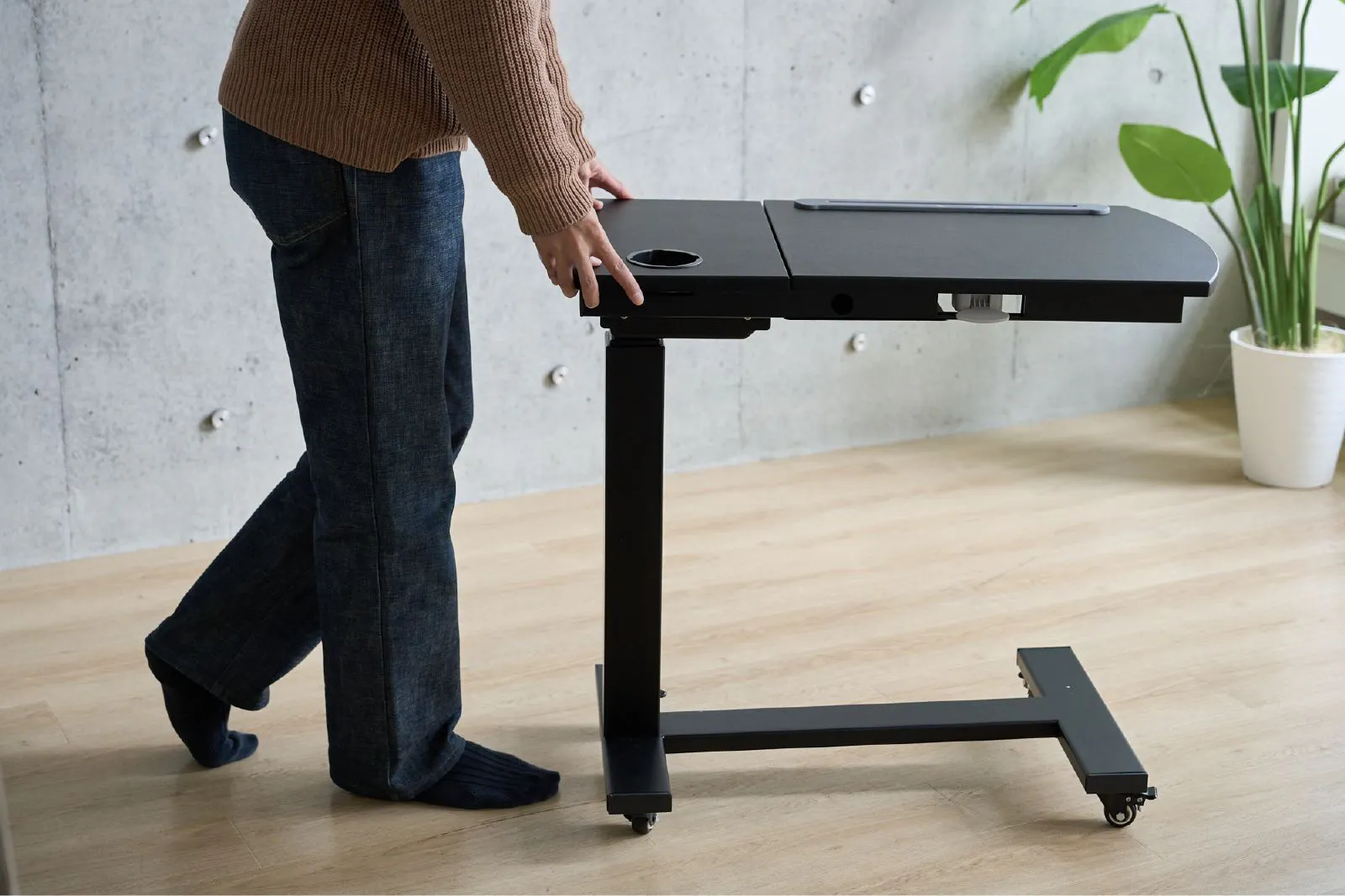 ・ソファの下などにデスクの脚を入れて、体に引き寄せて使うことが出来ます。