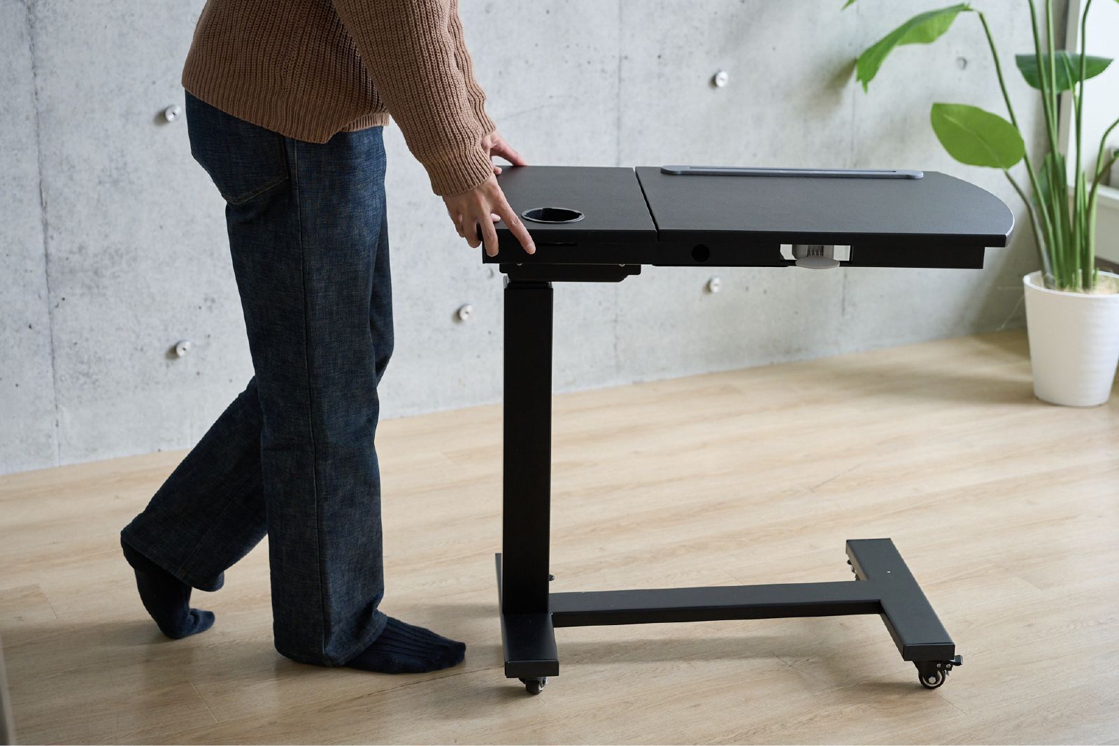 自分の一番快適な姿勢に高さを合わせられ、有線も無線も使える電動昇降サイドデスクの誕生です!