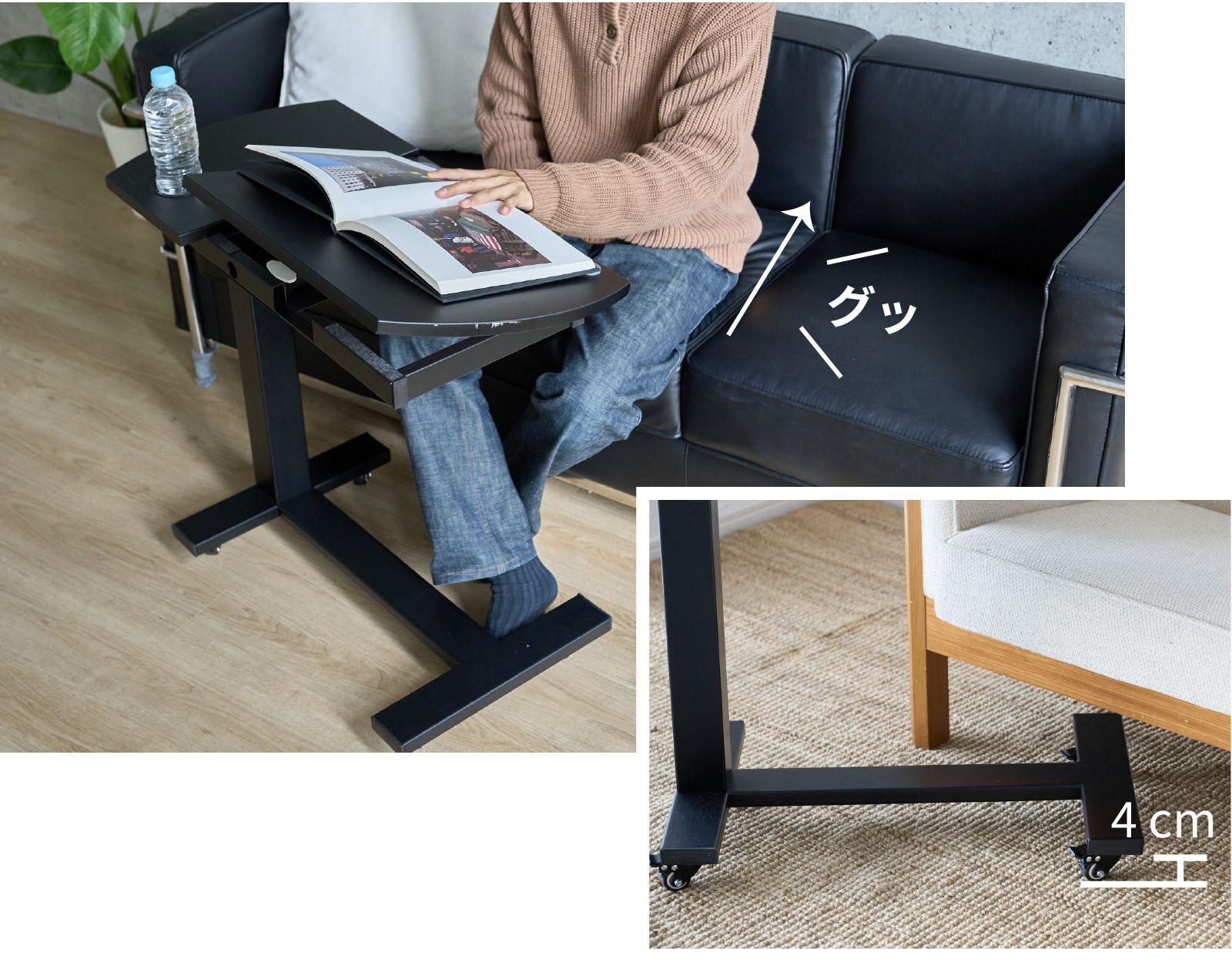 ・ソファの下などにデスクの脚を入れて、体に引き寄せて使うことが出来ます。