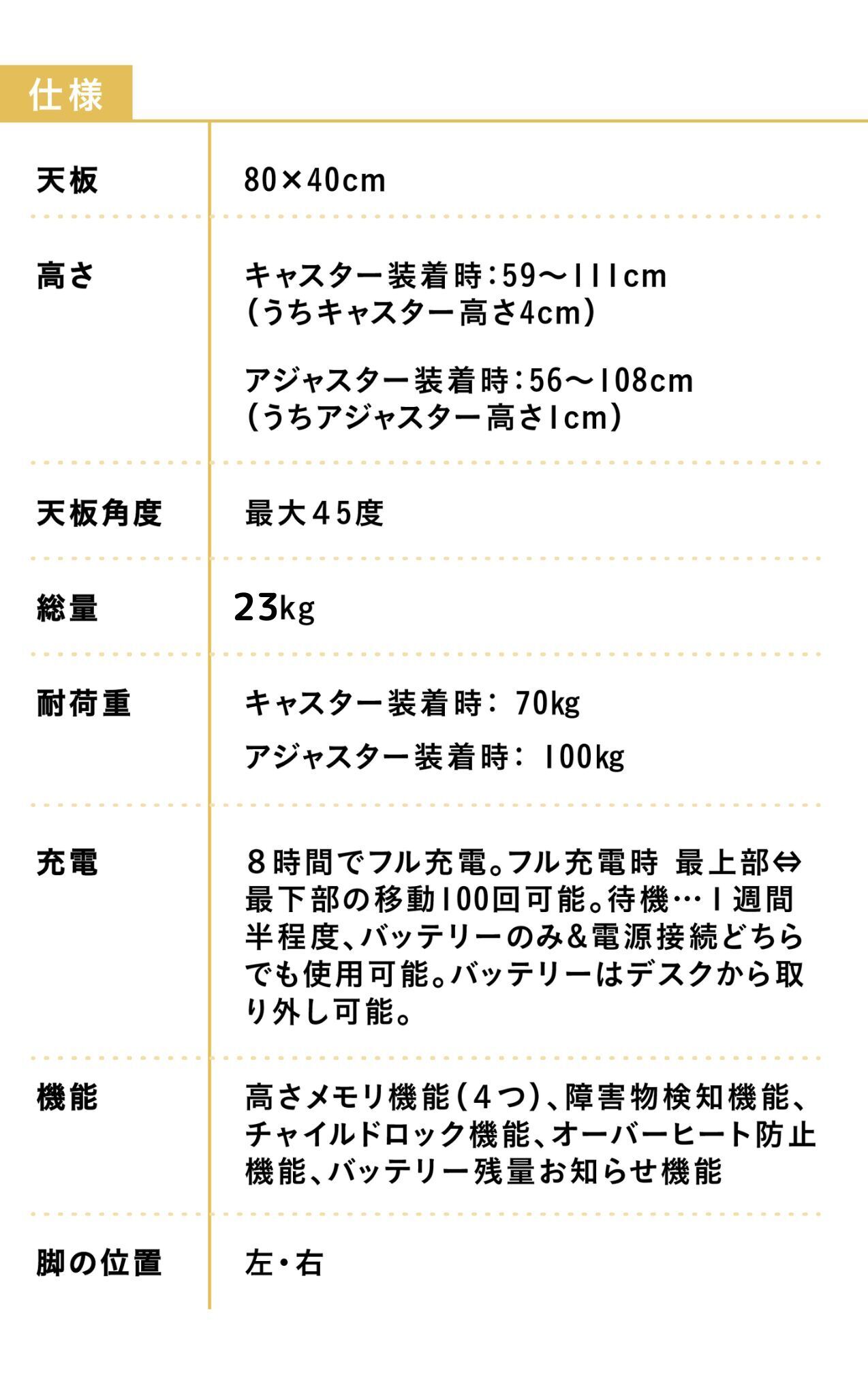 ・高さメモリ機能4つ 椅子の高さ・立った高さ・ソファの高さ・ベッドの高さなどに設定しておけば、毎回自動でジャストな高さに昇降!