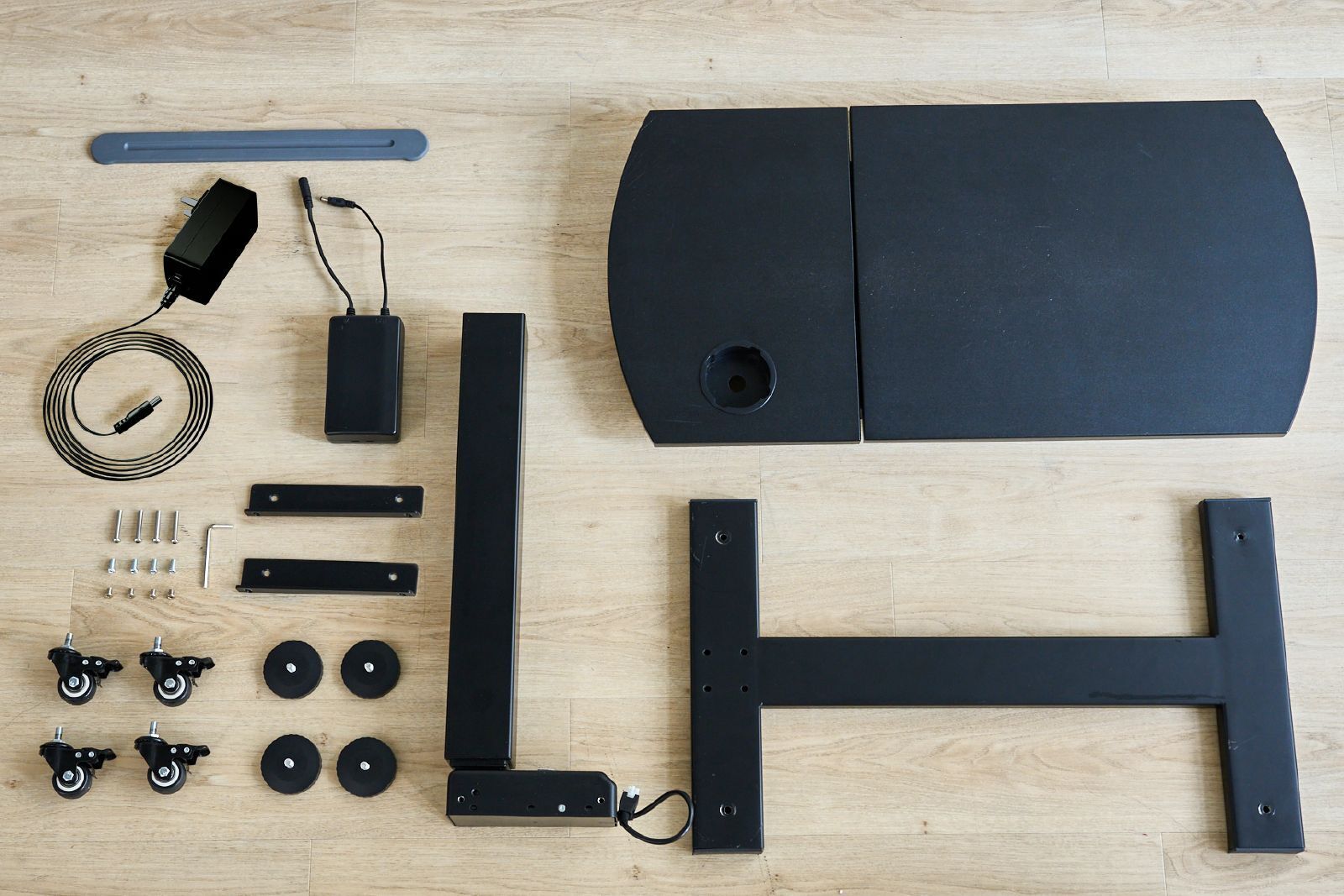 天板・脚部・バッテリー・電源コード(アダプタ付)・キャスター・アジャスター・滑り止め(粘着テープ付)・ネジ・取扱説明書・六角レンチ