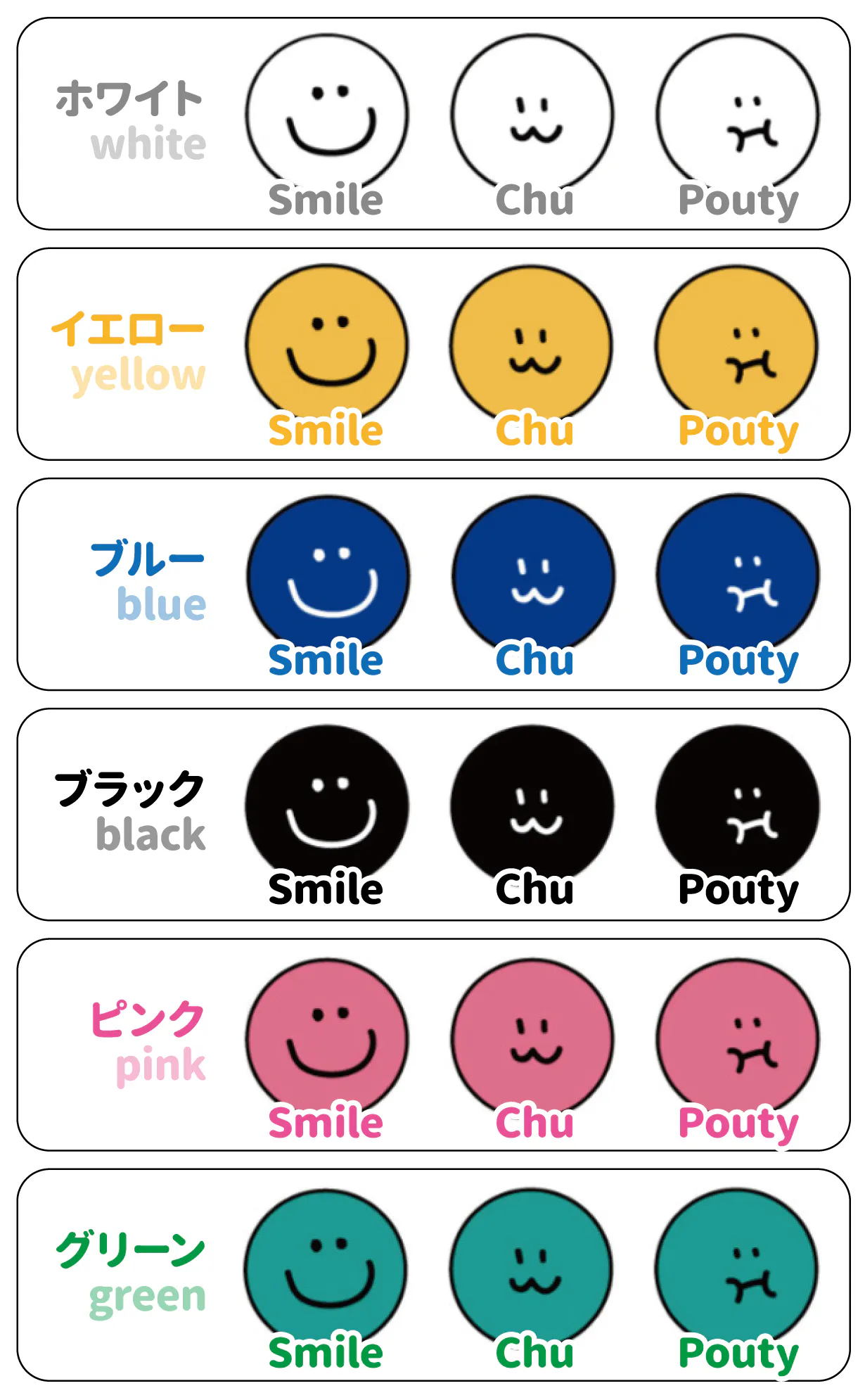 Smile(笑顔) Chu(チュー) Pouty(ふくれっ面)の表情豊かな愛らしいデザイン!