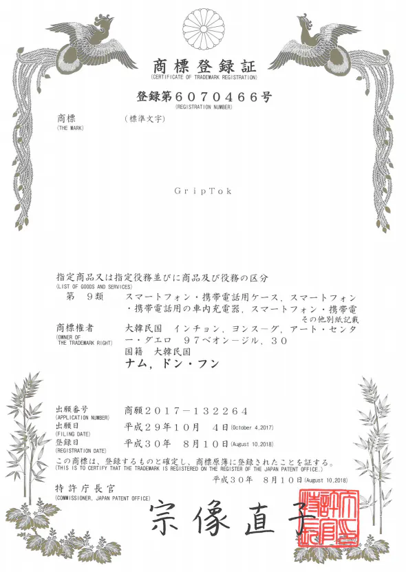 グリップトックは特許所有権者と特許ライセンス許可契約書を締結した正規品です。