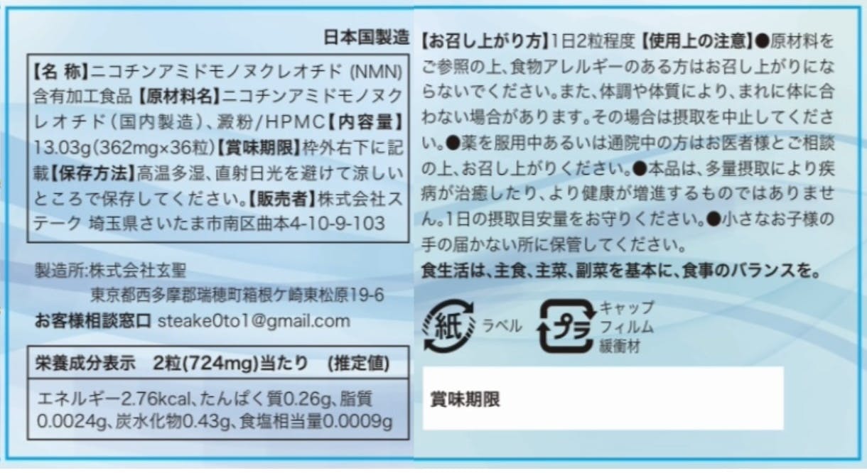 NMNサプリメント カプセル錠剤 36粒入13.03g(1錠362mg) NMN含有量9000mg(1粒250mg)