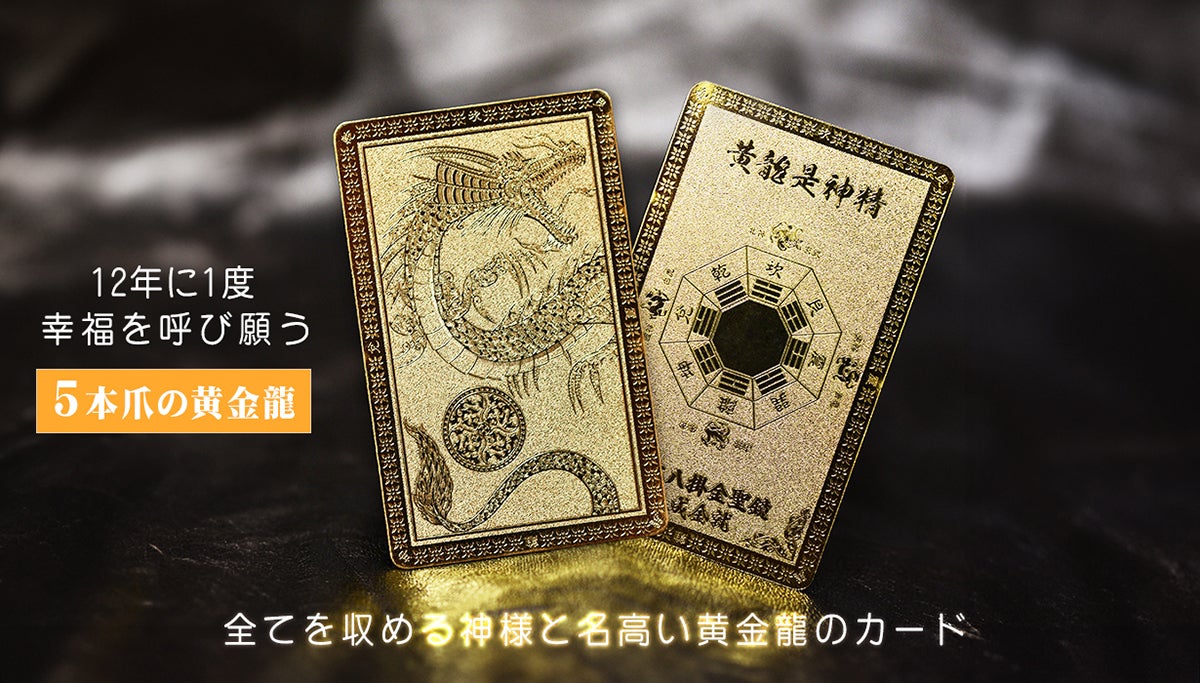 黄金に輝くカードの表には「東西南北」全方角の神様を従える最上位の龍である「5本爪めの黄龍」が描かれています。