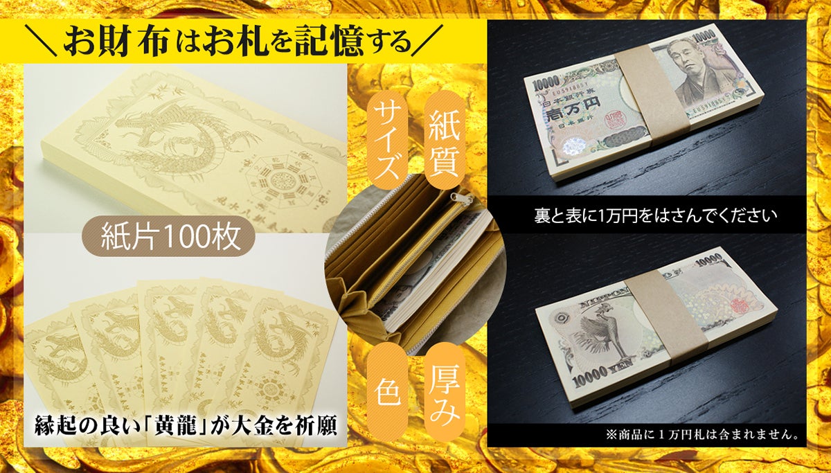 仲間を増やして、お財布にお金を記憶する。1万円札と全く同じサイズの紙を入れる事で運気を上げるとされているお札の元。