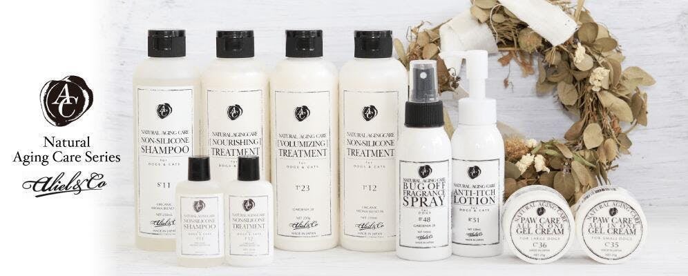 これらをもとに、ワンちゃんにやさしい植物由来のシャンプー剤を中心に多数用意しています。