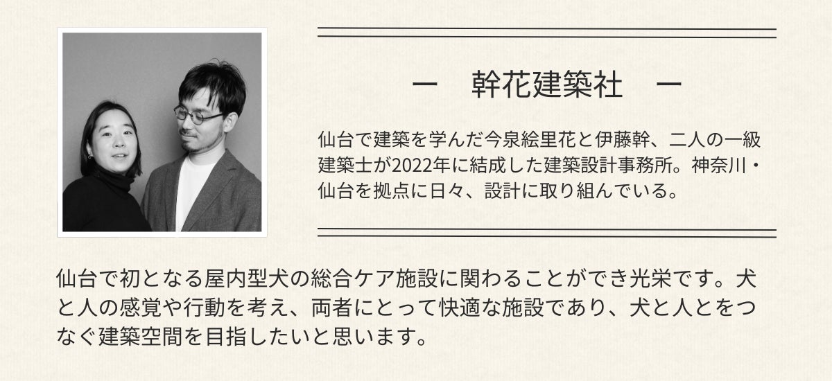 仙台では唯一の屋内ドッグランをはじめ、トリミングサロン、ホテル、保育園といった複合施設。これらのサービスは、愛犬との時間をもっと豊かにしたいという私自身の願いと一緒に働く2人の仲間の想いから生まれました。