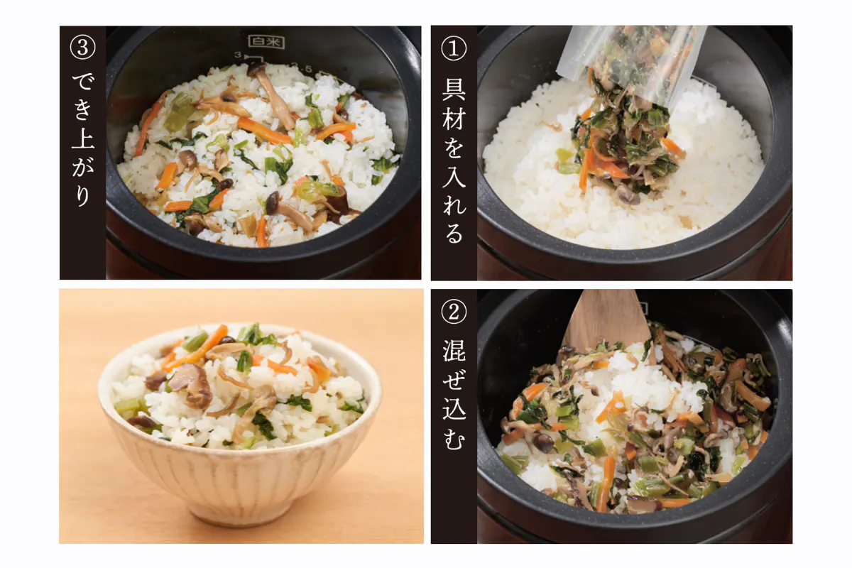 そのままでもおいしいお米をさらにもっとおいしくするため、贅沢な混ぜ込みご飯にしました。