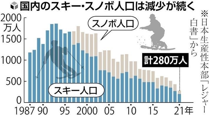 1990年代に若者を中心にブームとなり1800万人もの人がウィンタースポーツの虜となっていましたが、バブル崩壊や様々なレジャーの誕生により衰退していき、2020年の新型コロナウイルスの感染拡大がトドメとなり、ウィンタースポーツの人口はピーク時の4分の1まで落ち込んでいます。