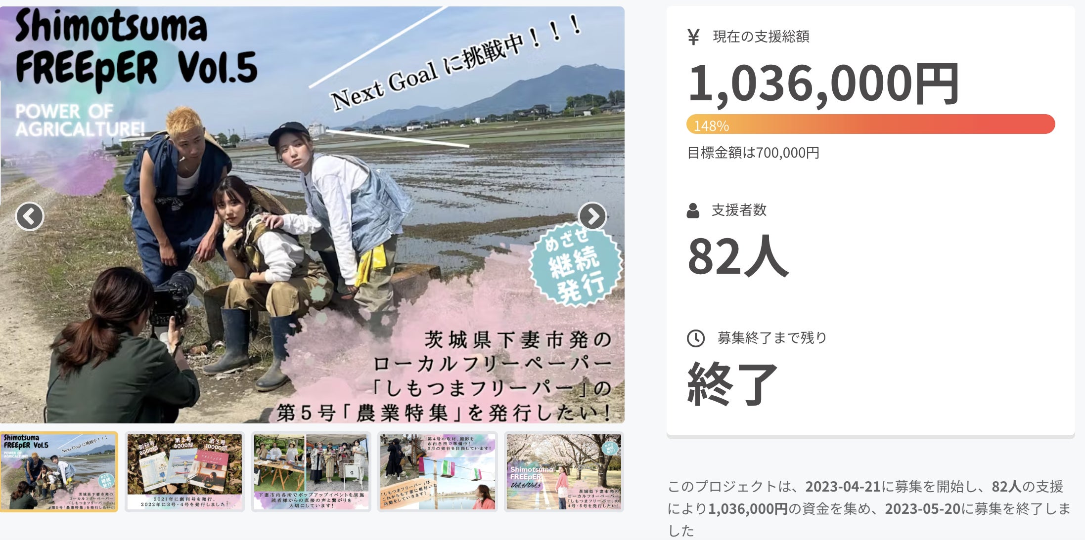 しもつまフリーパーは、2021年7月より「しもつまのいいトコロ見える化マガジン!」として創刊したフリーペーパーです。昨年2023年に行ったクラウドファンディング「茨城県下妻発のフリーペーパー・ShimotusmaFREEpERを発行したい!2」では、80名を超えるご支援者様の温かく心強いお力添えにより、ありがたくも編集資金として1,036,000円のご協力を頂きました!!改めまして、この場にて心よりお礼を申し上げます。