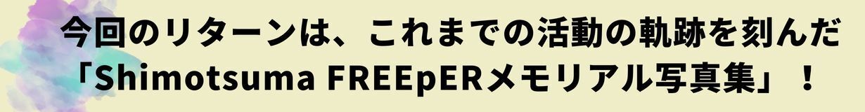 今回のプロジェクトのリターンは、第5号の発行を記念して、惜しくもフリーパー紙面に掲載できなかったMorinさん撮影のお写真や、編集部の写真、オフショットを選りすぐり「Shimotsuma FREEpERのメモリアル写真集」を制作!リターンとしてご提供致します。