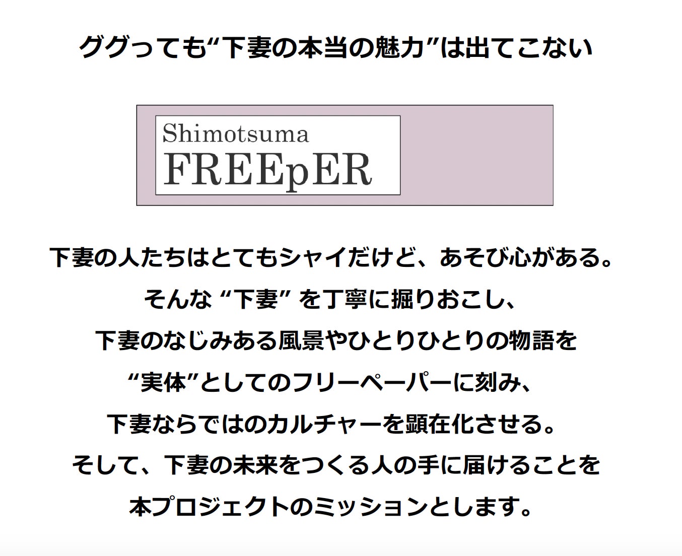 私たち「しもつまフリーパー編集部」は「フリーパーの出版活動を通して出会った「下妻の発見」を紙に刻み、「下妻ならではのカルチャーを顕在化させ、下妻の未来をつくる人の手に届けること」をプロジェクトミッションとして掲げています。
