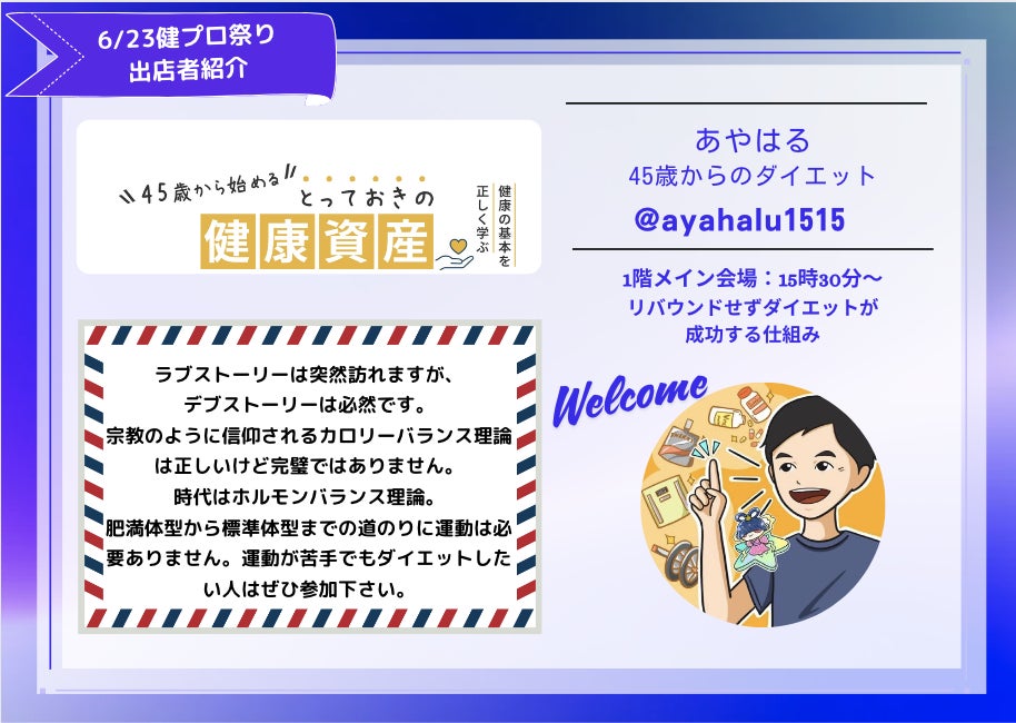 2024/05/31 19:58こんにちは、健プロサロン主宰のいのぴーです!6/23メイン会場15時30分〜からは、あやはるさんによる、ダイエットセミナー「リバウンドせずダイエットが成功仕組み」です。あやはるさんは、過去、90キロまで太り、急性膵炎で緊急入院、そこから生活習慣を見直し、1年で20キロの減量に成功。ご自身の経験プラス、ダイエット検定1級の資格も持ち、現在は、オンラインダイエットコーチもされています。昨年は、サンクチュアリ出版にて、初のセミナーも大盛況でした。何と言っても、あやはるさんのワードセンスには、Xでも思わず笑ってしまいます。6/23当日も、楽しいセミナーになること間違いなしです!!ぜひ、あやはるさんに会いに来てください!あやはるさんの情報はこちらから↓ ↓ ↓https://x.com/ayahalu1515あやはるさんのコミュニティが発足します!↓==================================(あやはるさんXより)インスリンを制する者はダイエットを制します。運動したくない、過度なカロリー制限はしたくない。 そんな人のために 「あやはるダイエット部」を創設します。 6月1日18時から開始です。==================================僕も入部します!!それでは、引き続き、健プロクラファンの応援・支援のほどよろしくお願いします!いのぴー もっと見る