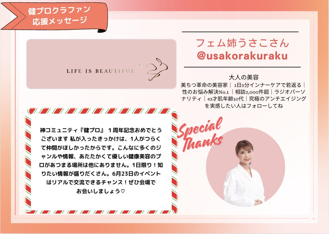 【応援メッセージ】こんなに多くのジャンルや情報、 あたたかくて優しい健康美容のプロが あつまる場所は他にありません。フェム姉うさこさん