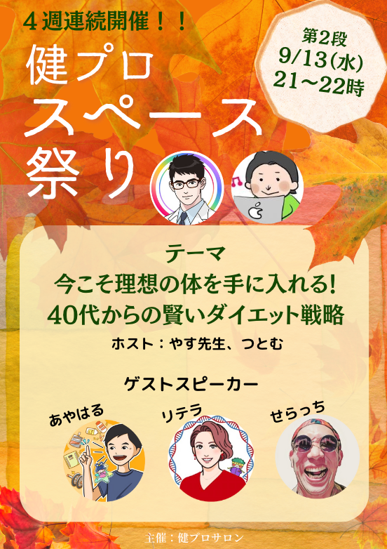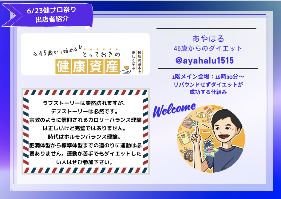 2024/05/31 19:58こんにちは、健プロサロン主宰のいのぴーです!6/23メイン会場15時30分〜からは、あやはるさんによる、ダイエットセミナー「リバウンドせずダイエットが成功仕組み」です。あやはるさんは、過去、90キロまで太り、急性膵炎で緊急入院、そこから生活習慣を見直し、1年で20キロの減量に成功。ご自身の経験プラス、ダイエット検定1級の資格も持ち、現在は、オンラインダイエットコーチもされています。昨年は、サンクチュアリ出版にて、初のセミナーも大盛況でした。何と言っても、あやはるさんのワードセンスには、Xでも思わず笑ってしまいます。6/23当日も、楽しいセミナーになること間違いなしです!!ぜひ、あやはるさんに会いに来てください!あやはるさんの情報はこちらから↓ ↓ ↓https://x.com/ayahalu1515あやはるさんのコミュニティが発足します!↓==================================(あやはるさんXより)インスリンを制する者はダイエットを制します。運動したくない、過度なカロリー制限はしたくない。 そんな人のために 「あやはるダイエット部」を創設します。 6月1日18時から開始です。==================================僕も入部します!!それでは、引き続き、健プロクラファンの応援・支援のほどよろしくお願いします!いのぴー もっと見る