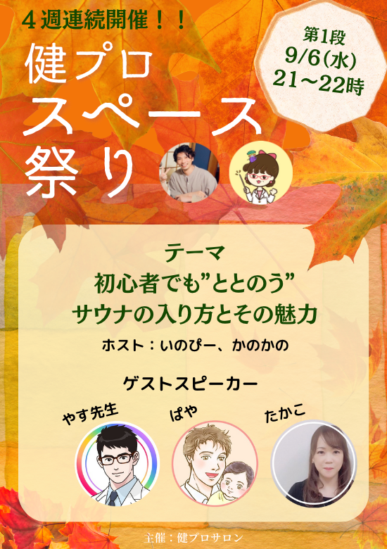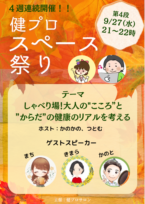 人生初めてのオフ会、人生初めてのスペース、それは健プロサロンの仲間とでした。単に医者をやっているだけでは、絶対に出会うことのできない人たちと出会うことができました。私は健プロの大ファンです。健プロをずっと応援します。