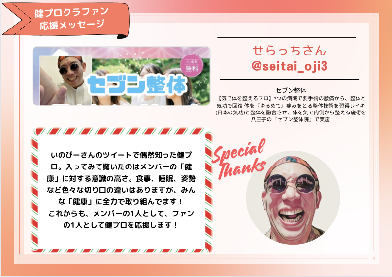 【応援メッセージ】これからも、メンバーの1人として、 ファンの1人として健プロを応援します!せらっち