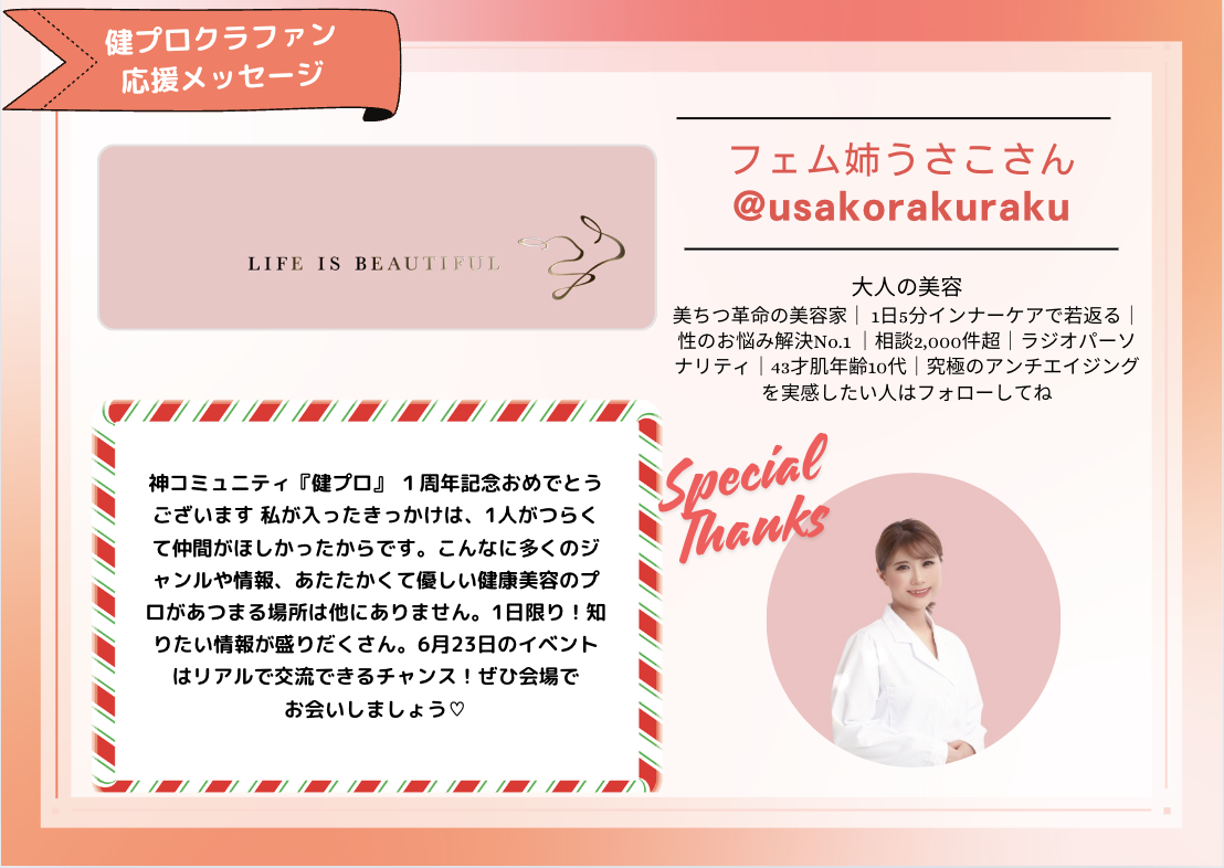 【応援メッセージ】こんなに多くのジャンルや情報、 あたたかくて優しい健康美容のプロが あつまる場所は他にありません。フェム姉うさこさん