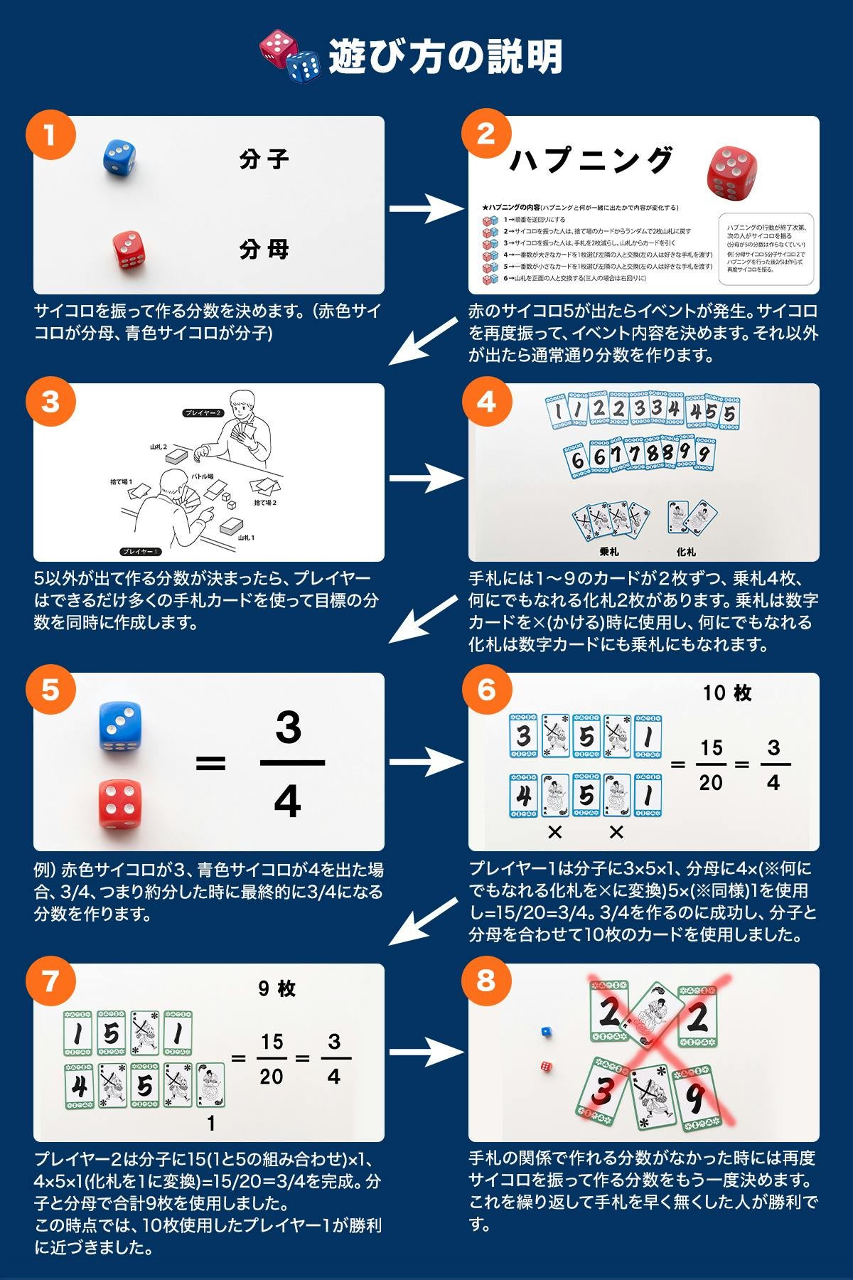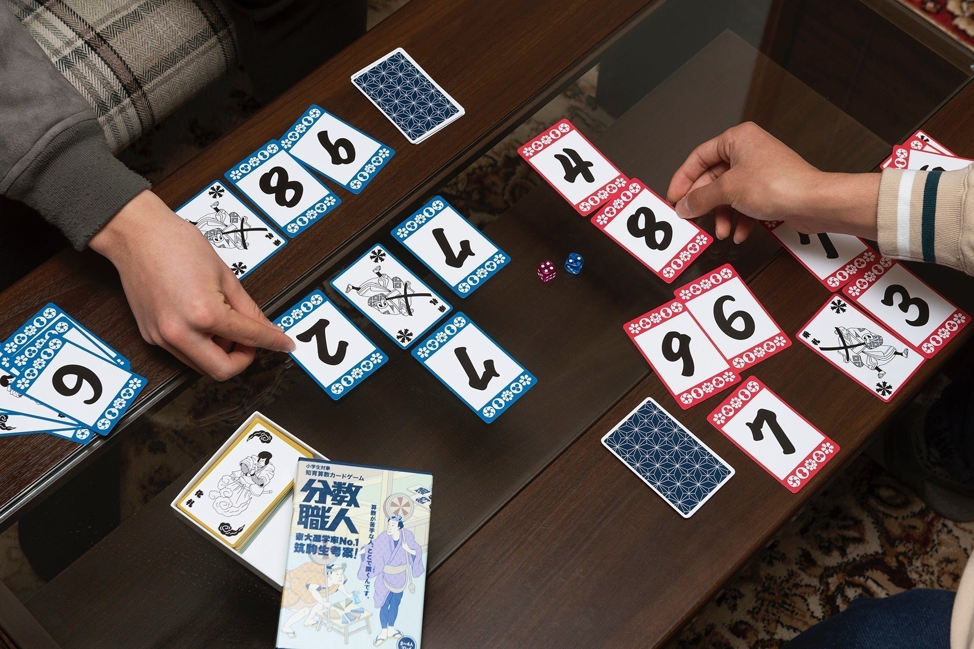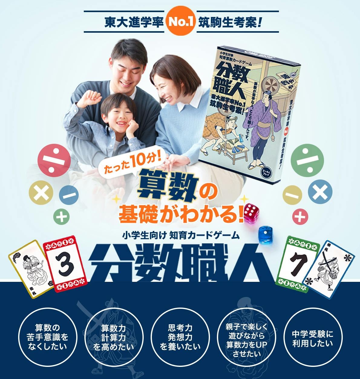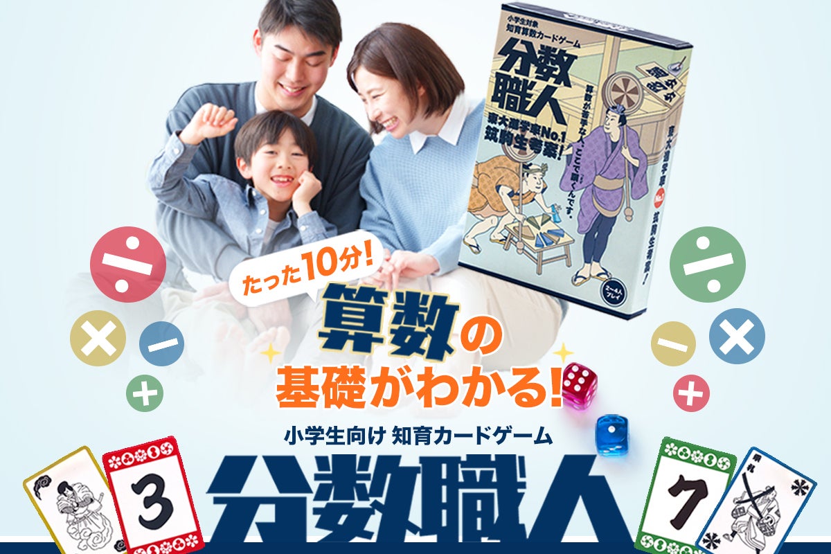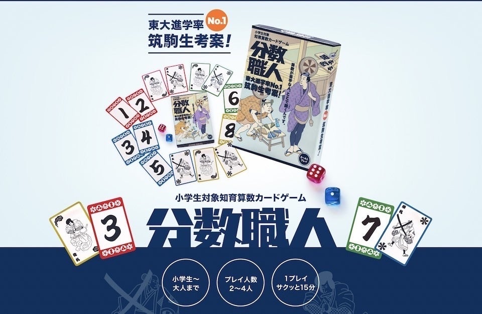 「分数職人」はサイコロで指定されたランダムな分数を手札のカードによって作り、職人のように算数が上手になるカードゲームです。このゲームは東大進学率No.1を誇る進学校”筑波大学附属駒場高等学校”(通称:筑駒)の生徒が考案し、累計1万部をこえる人気知育カードゲームとなりました、このゲームではカードを用いて何度も分数に触れ合うことにより、算数の基礎が解り、計算能力を高めることができます。シンプルな内容ですので、小学生からお年寄りまで、純粋に計算を楽しみたいという方から、算数苦手を克服したいという方まで幅広くの方が楽しめる内容となっております。