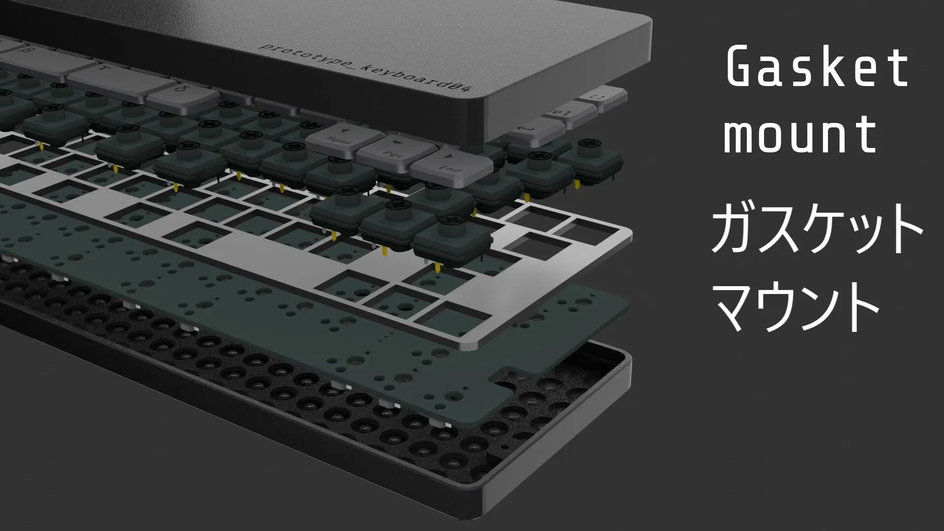 キーボードの基盤をフレームで挟み込むことでなるべく打鍵音が響かないような構造を採用しております。