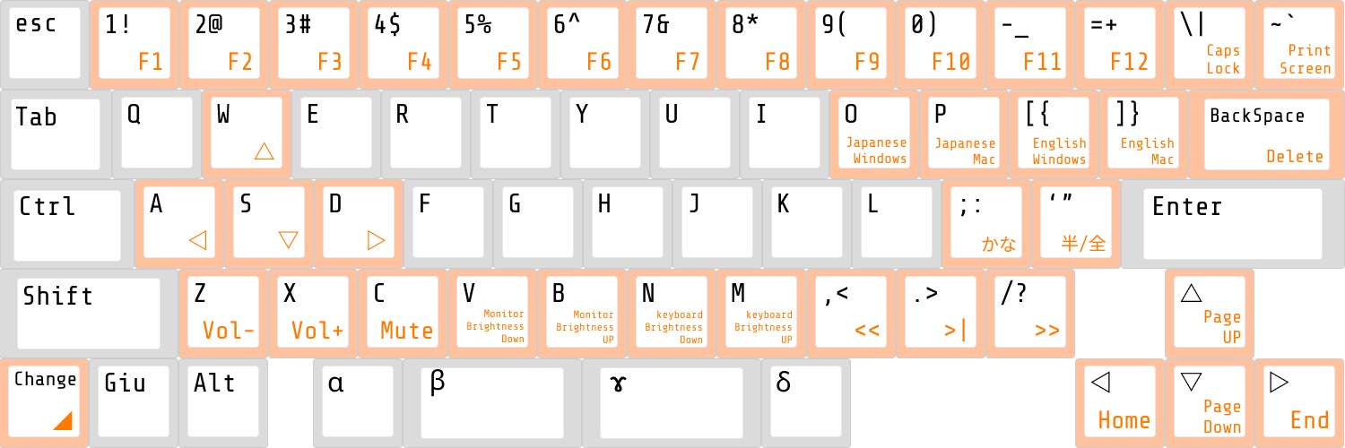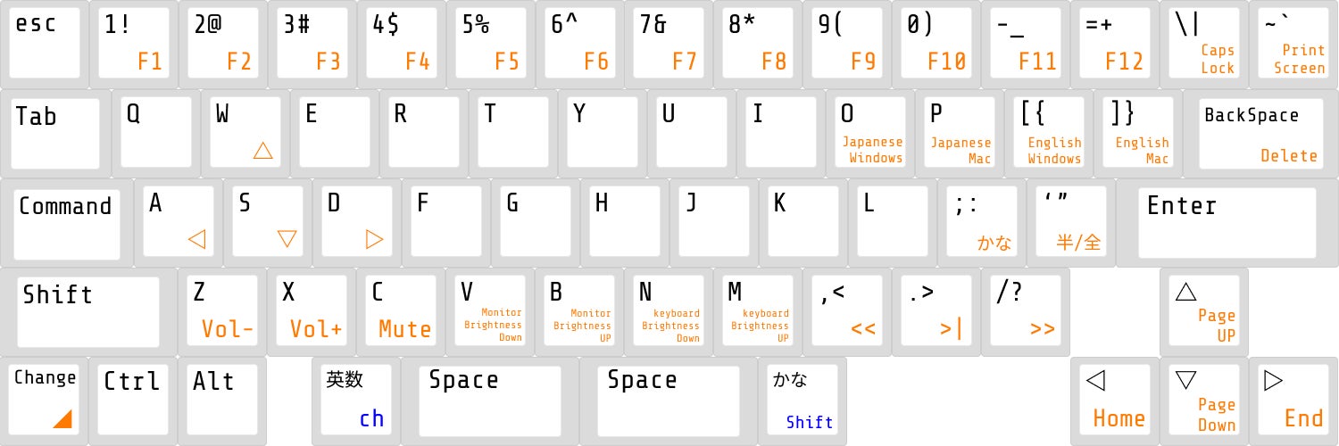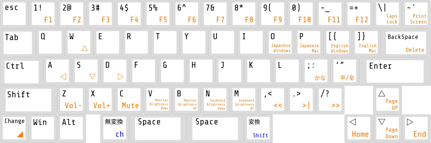 Fキーは左下にあるチェンジキーを長押しすることでオレンジ色の部分のキーは変化します。キー配列を変更する場合もチェンジキーから変更します。よく使うと思われるボリューム、モニター光量、キーボード光量、再生ストップ機能を最下段にキャプスロックにプリントスクリーン、Home、End、PageUP、PageDownとりわけAWSDが十字キーに変化する部分はタッチタイプの利便性を高めます。
