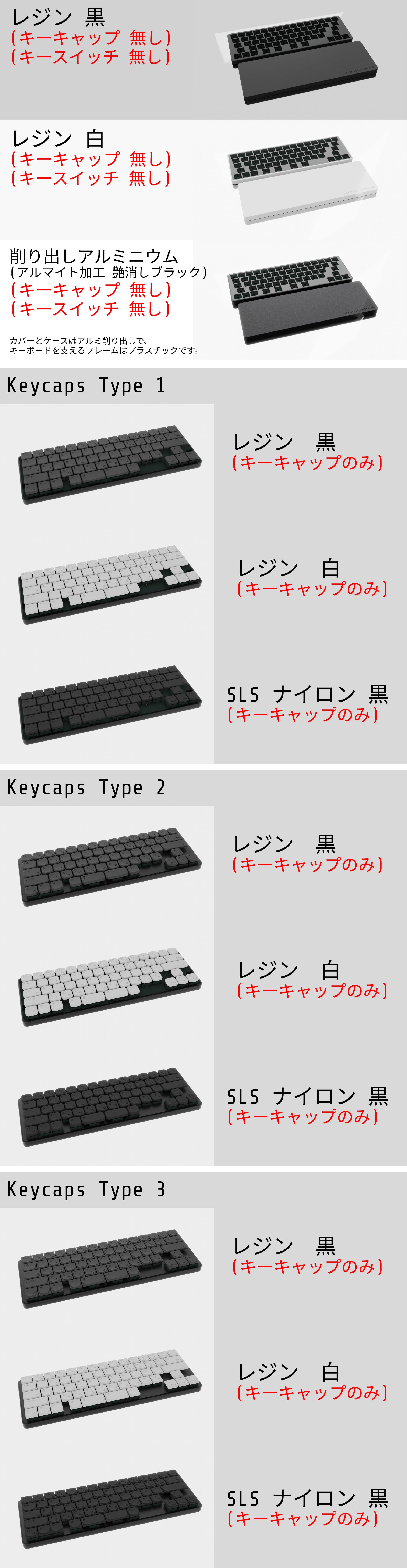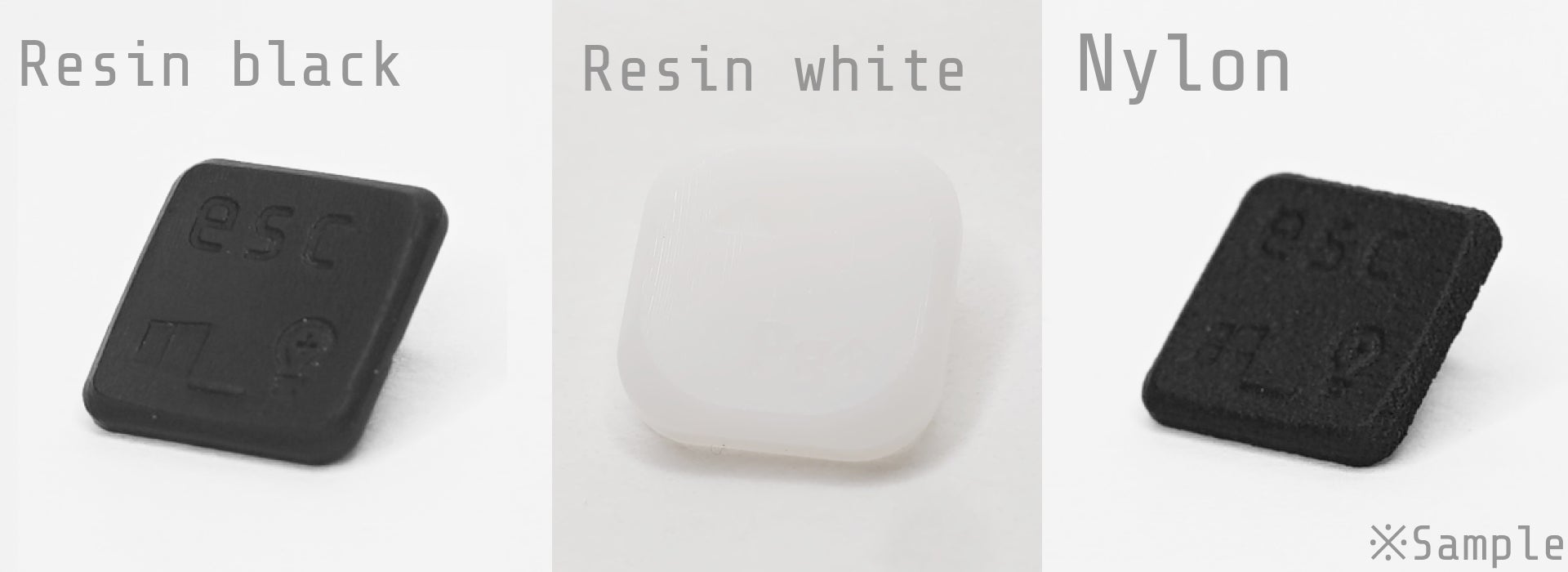 キーキャップとして選べる素材は "Resin Black" "Resin White" "Nylon Black" の3種類