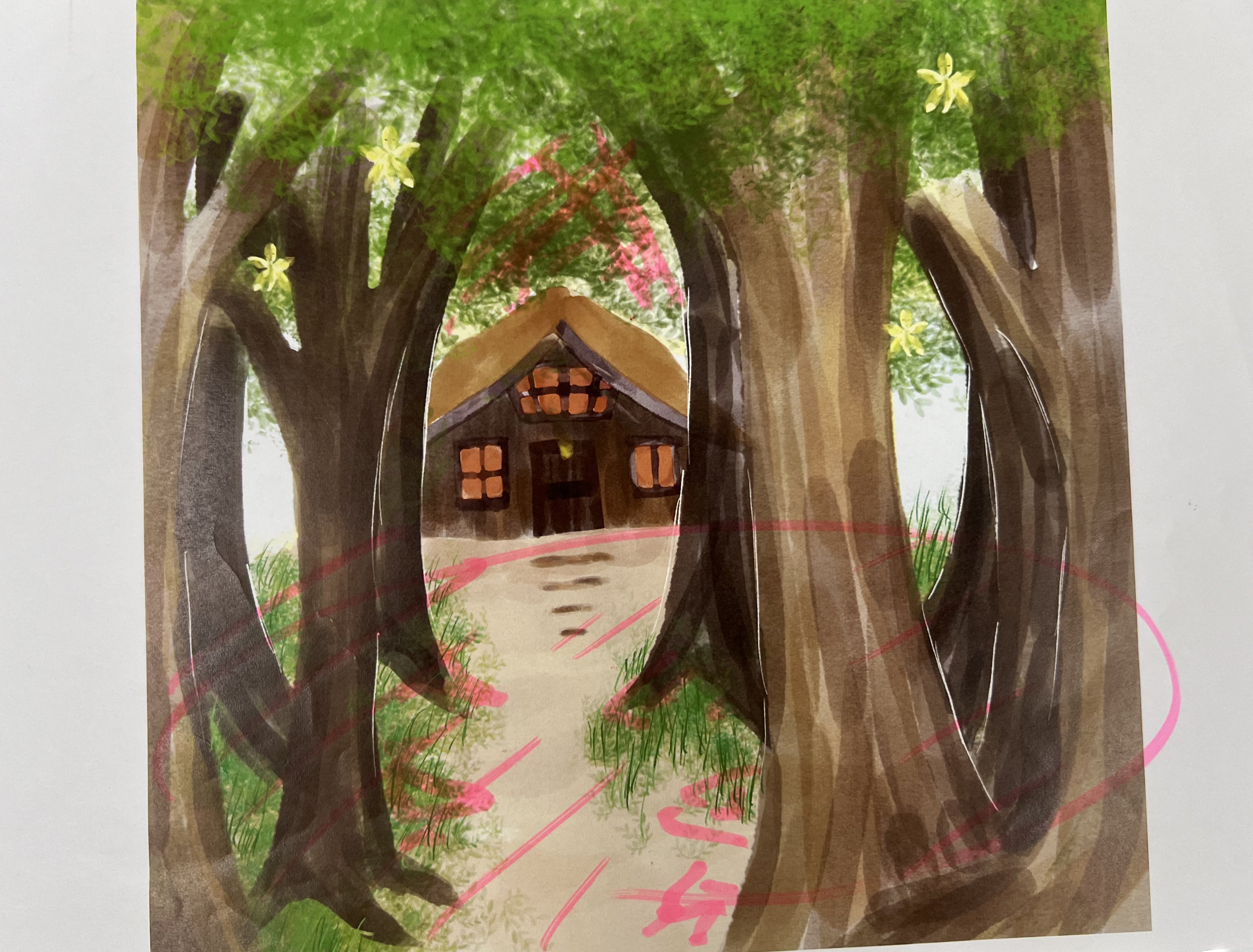 下絵では木が整列しすぎていたので不揃いに配置しました。影を印象的に見せるために、アーヤのお家の方から光が射している感じにしましたがイマイチでした。木があまりにも細く弱弱しすぎたため、太く描き直すことにしました。