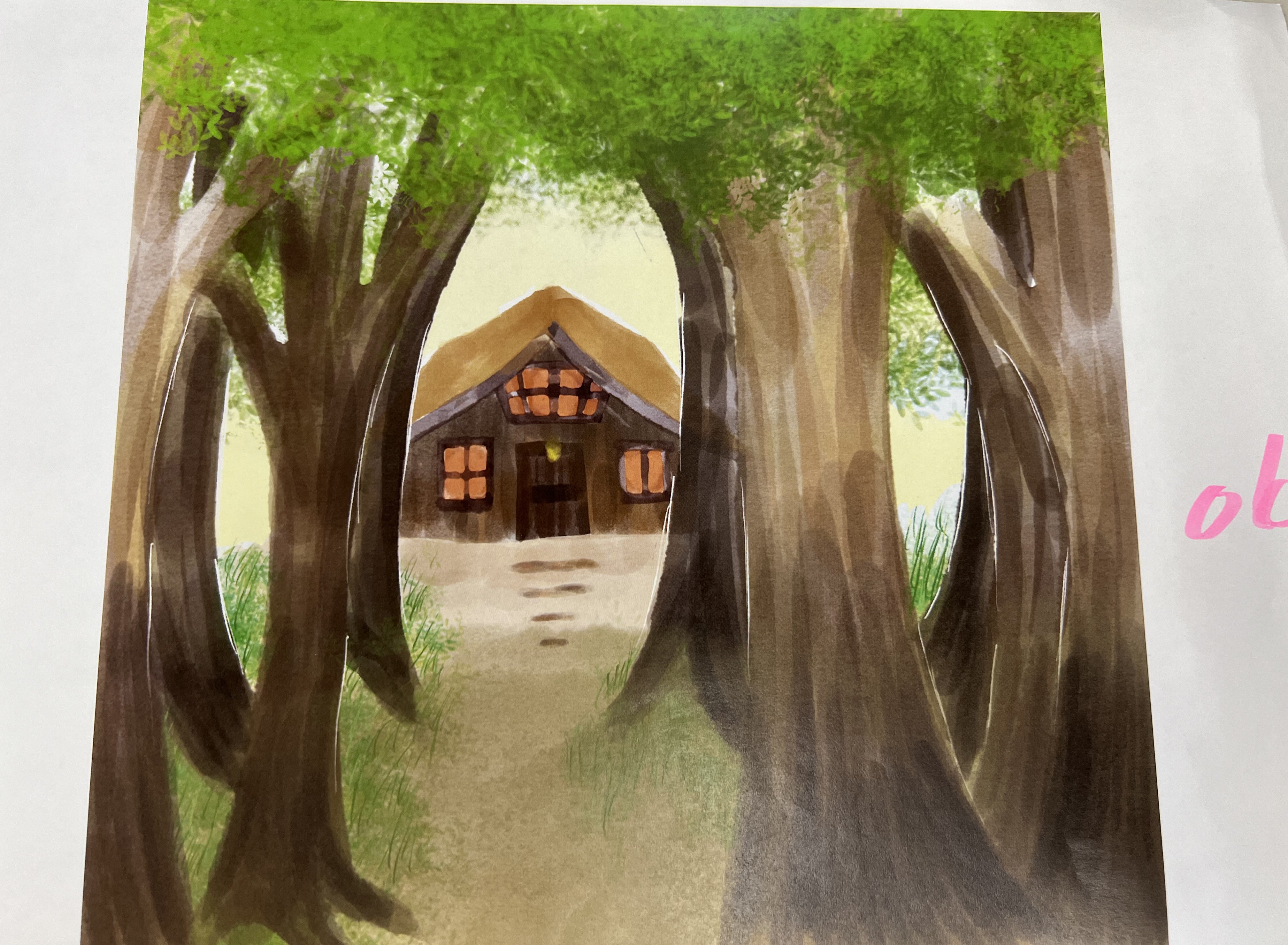木々には動きのある緑を何色も塗り足しました。木の根っこにも苔らしき色を描き足しました。ひかりの妖精 “ マヨネイズ” は、ヒョウスケくんを見守るように配置して、完成しました!