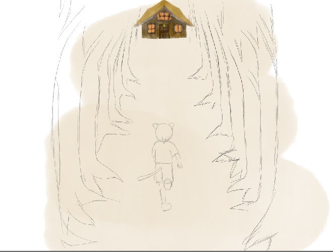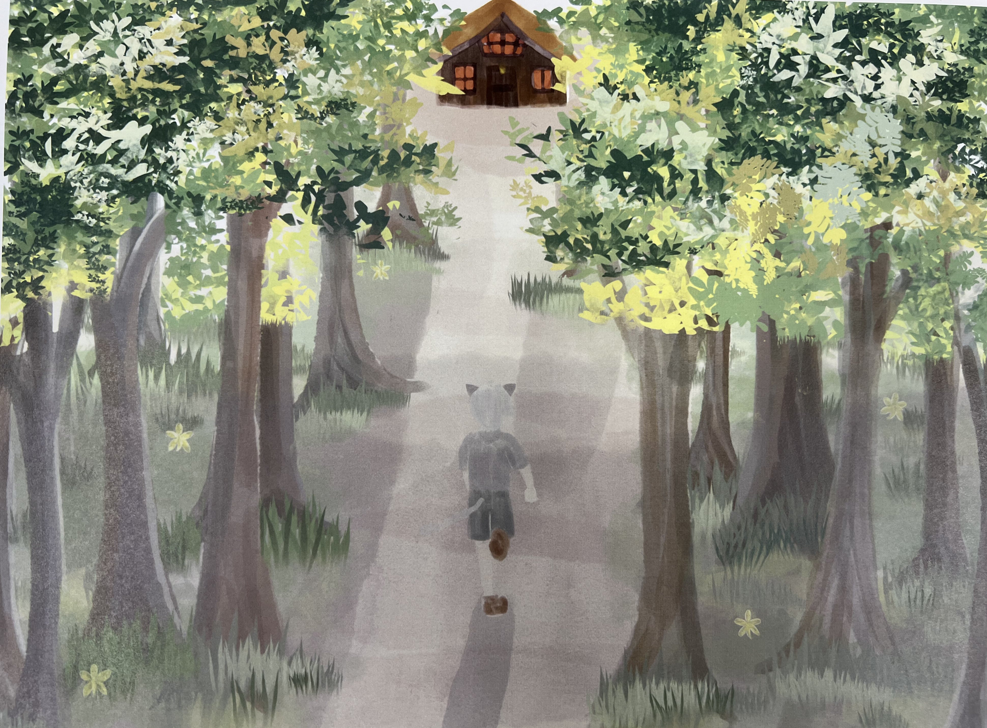 『アーヤと森とふしぎなひかり(その3)』に出てくる、ヒョウスケくんがアーヤのお家に走っていくシーンです。