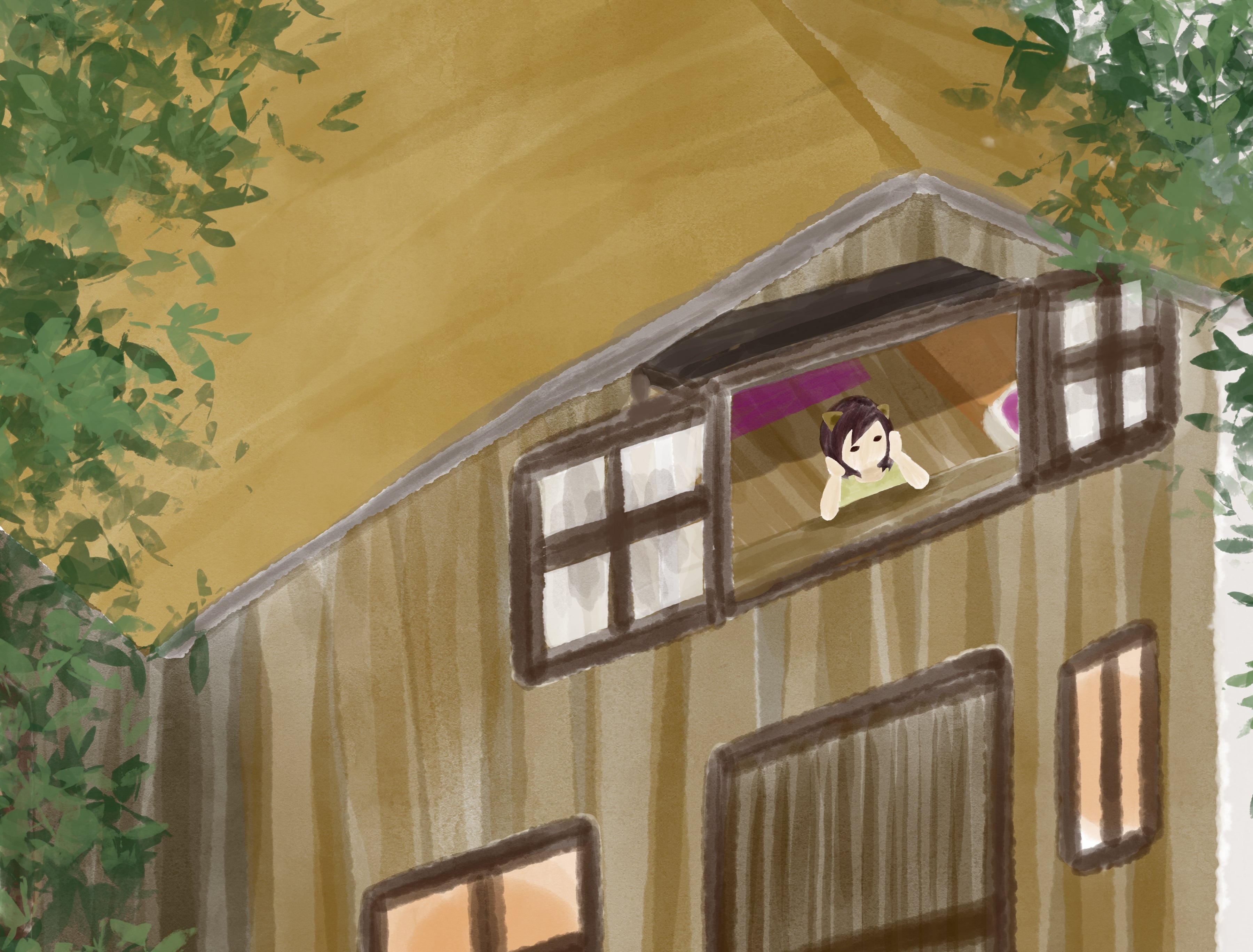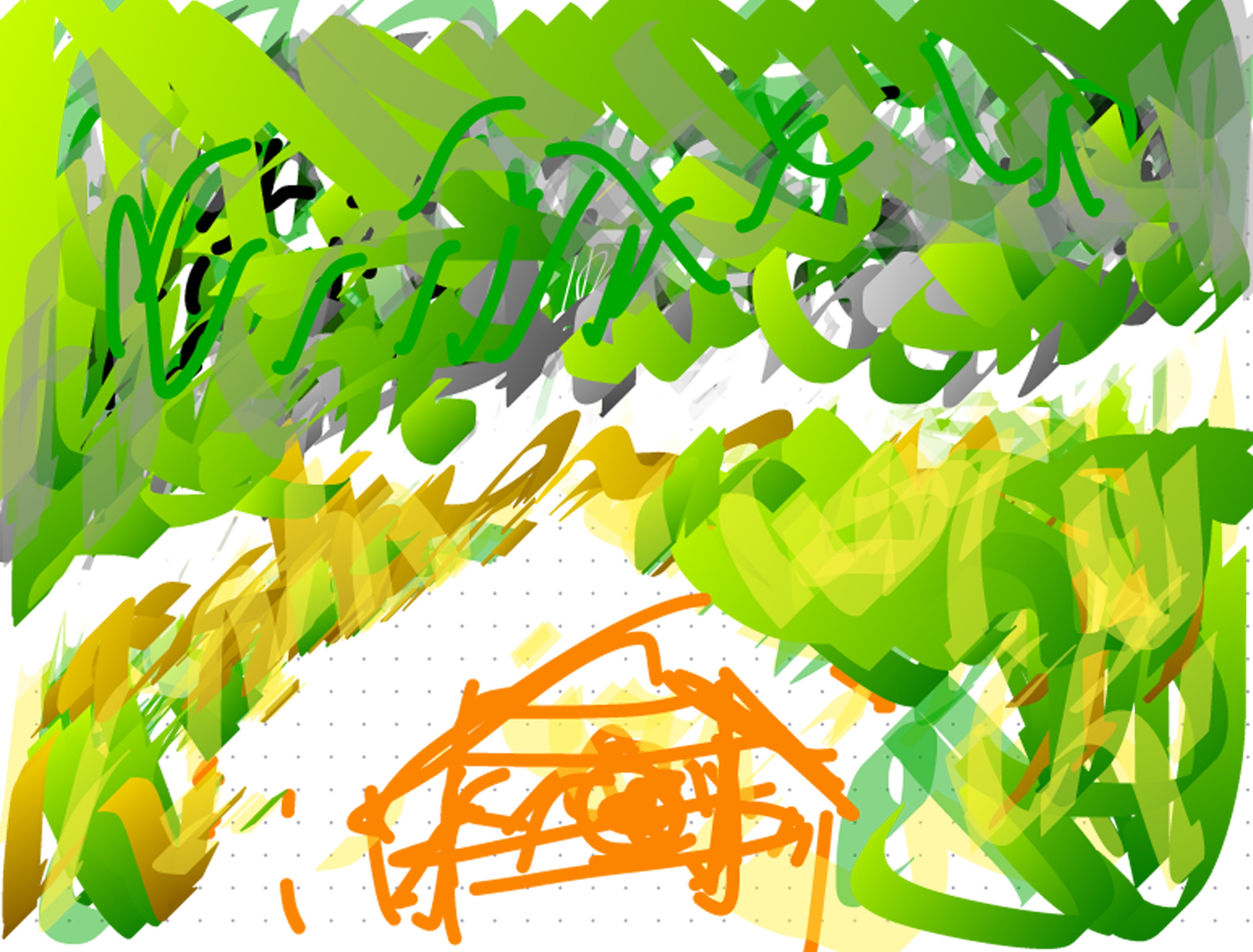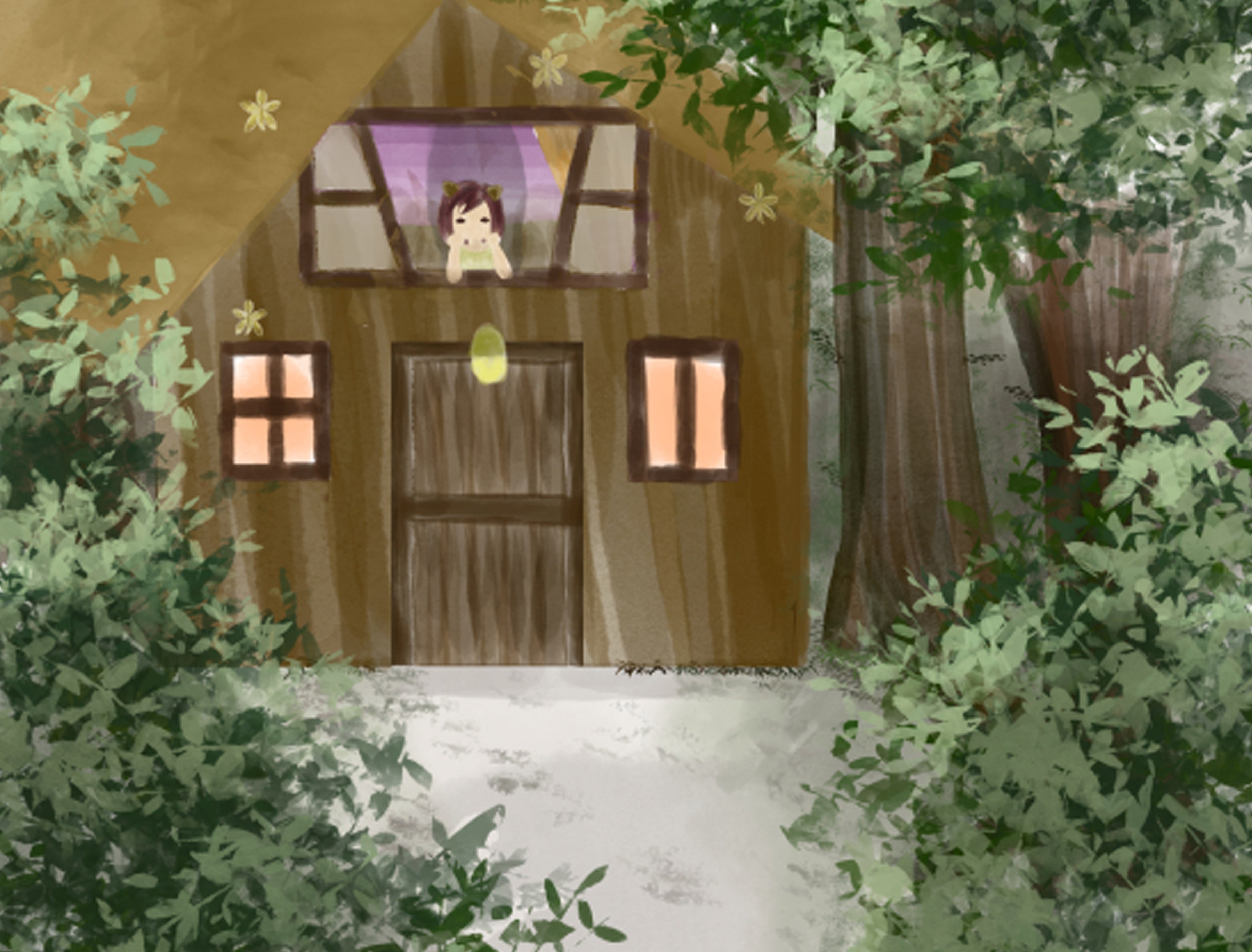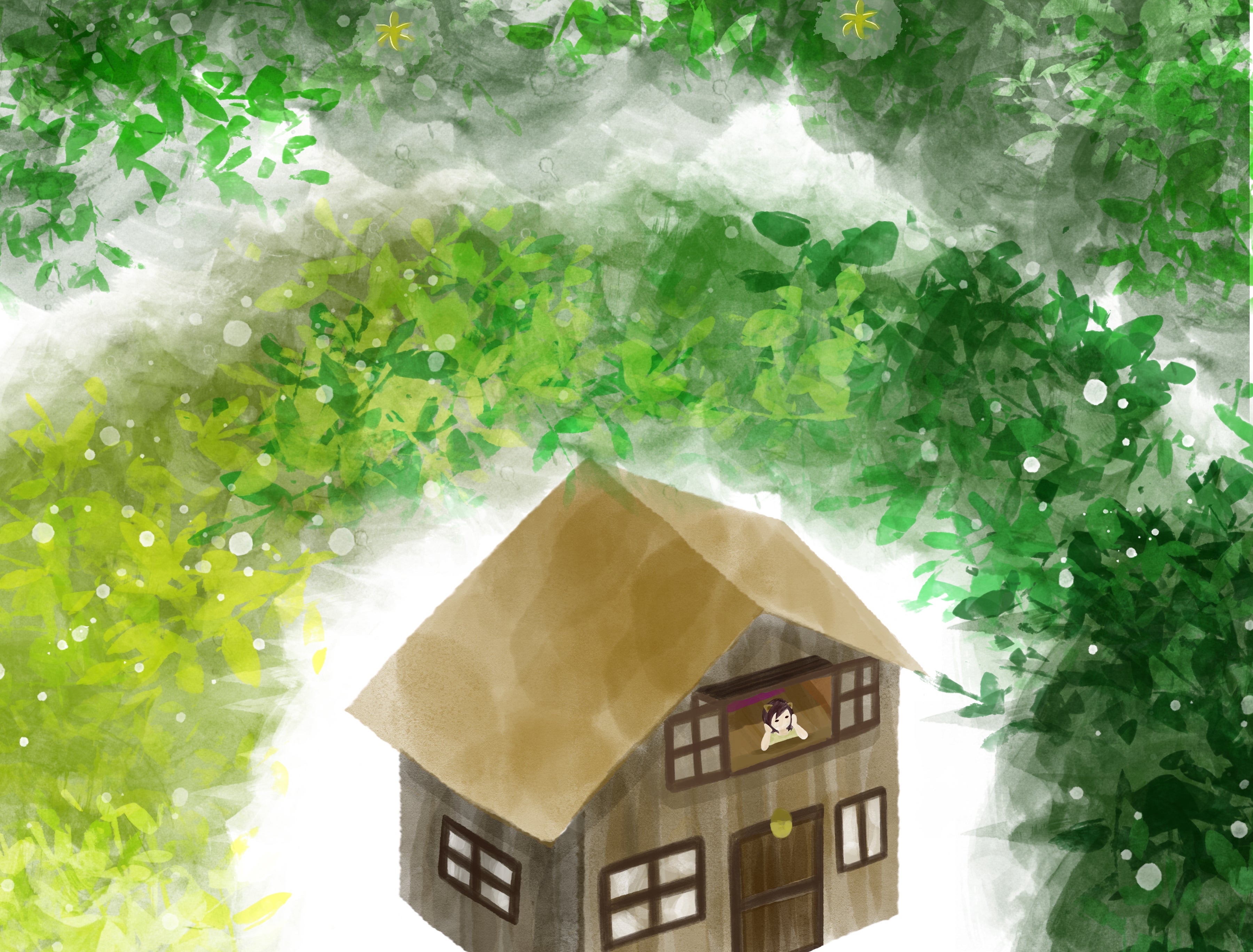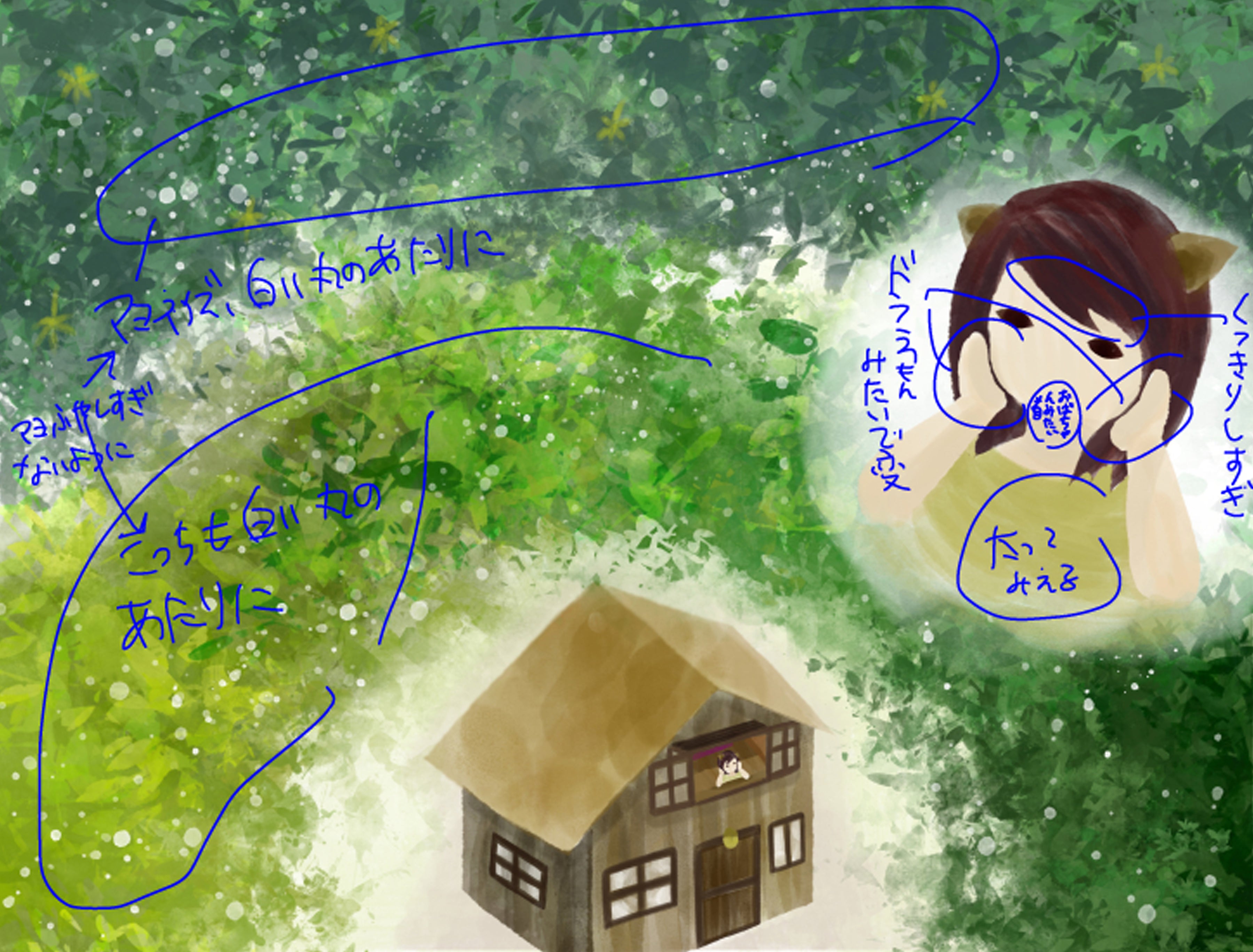 絵に奥行を持たせるために、斜め上から描き直しました。森の中の家感がないので描き直しです。