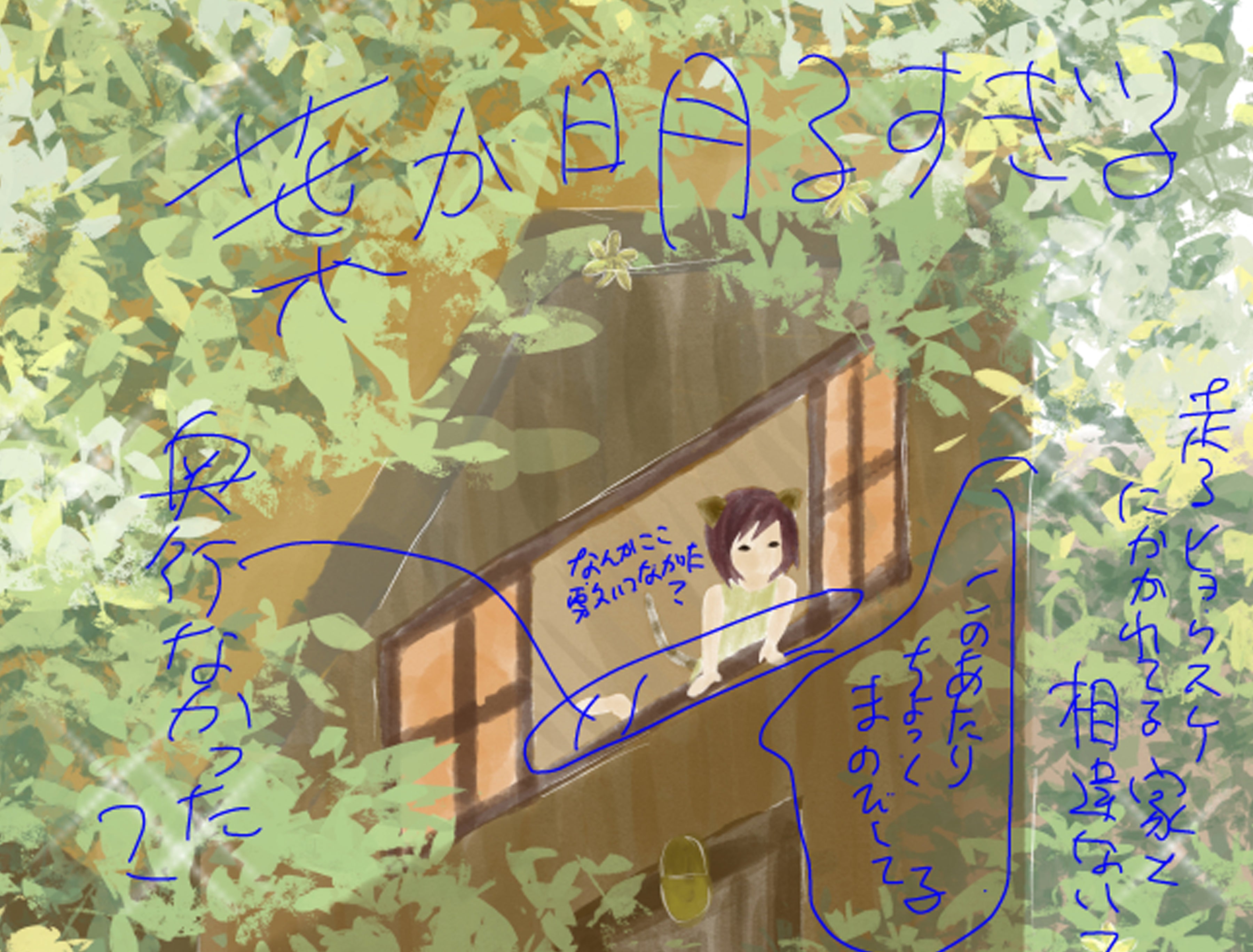 森を眺めているアーヤを右上に描き足しました。アーヤが少し小太りに見えるため、スッキリと見えるように描き直しです。