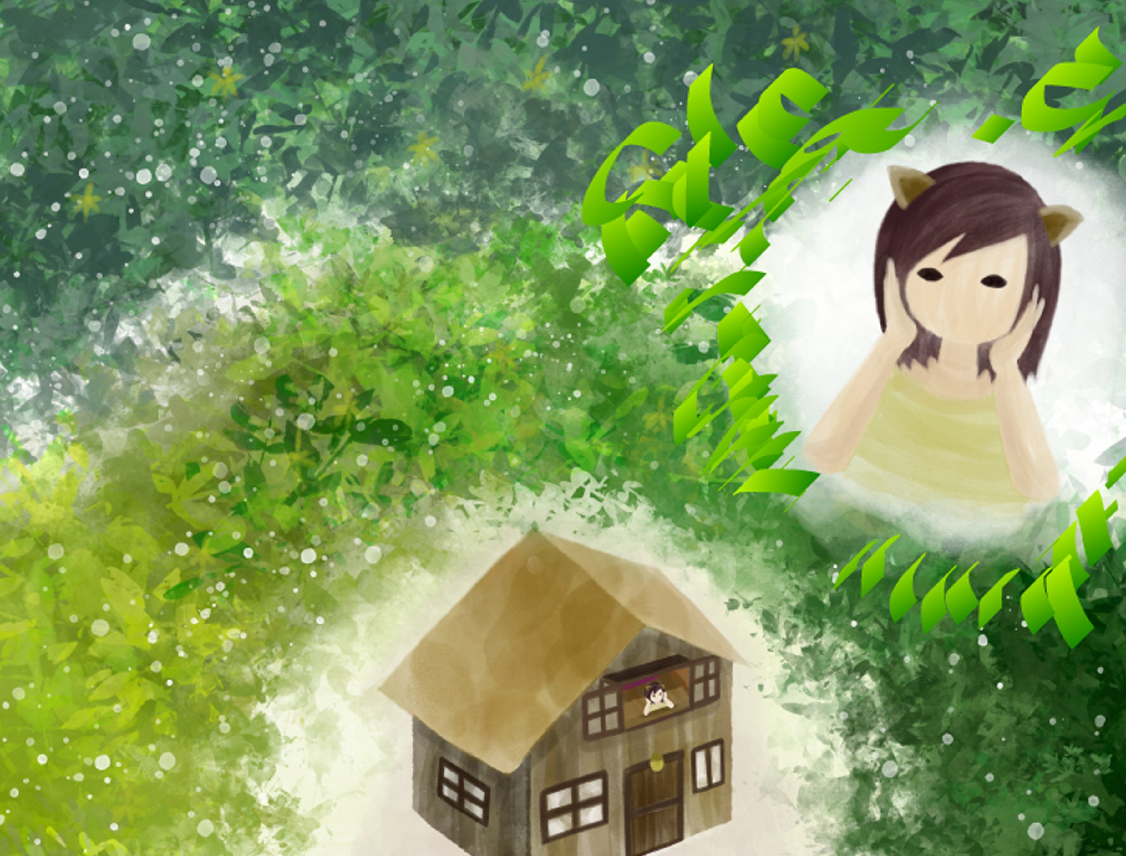 アーヤがあまりにも小さすぎて物足りないので、描き直しです。木々の緑にひかりの妖精“マヨネイズ”を散りばめました。