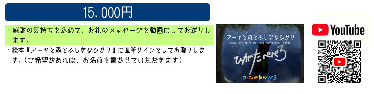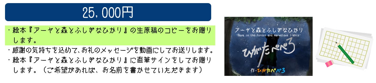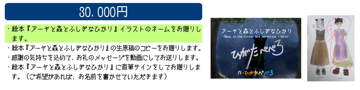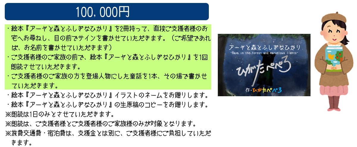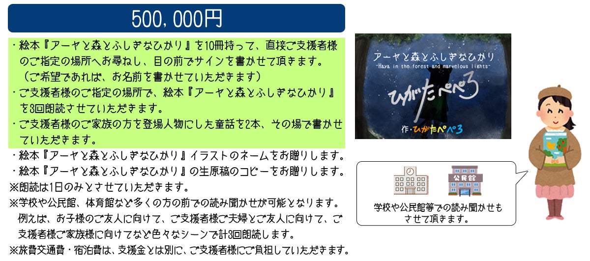 さらに、一番高額のご支援を頂いた方には、ひがたぺぺろが直接ご支援いただいた方の元へお伺いし、直接『アーヤと森とふしぎなひかり』を朗読させていただきます