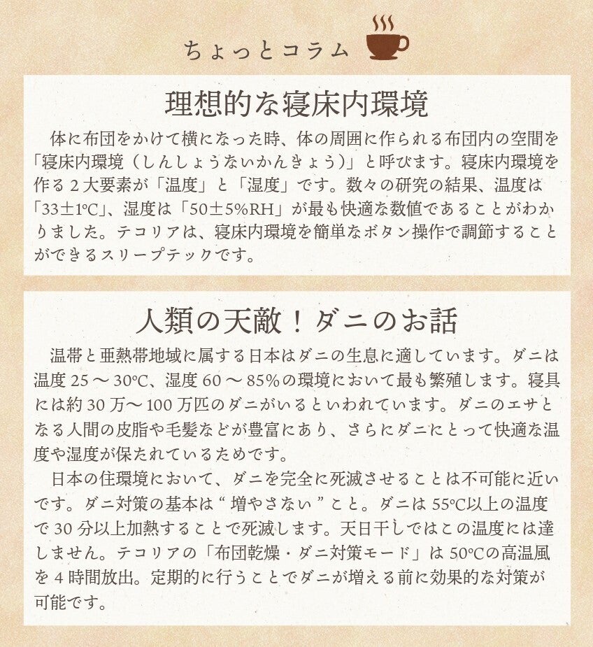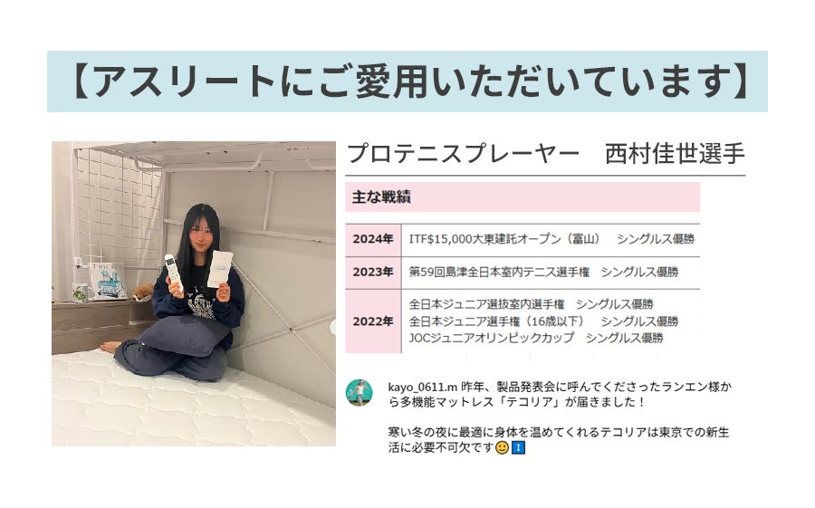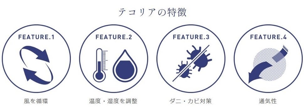 2023年から、特許技術の多機能循環機によりマットレス内の温度・湿度をコントロールし、快眠をサポートするマットレス「TECOREA(テコリア)」シリーズを日本国内に展開しています。