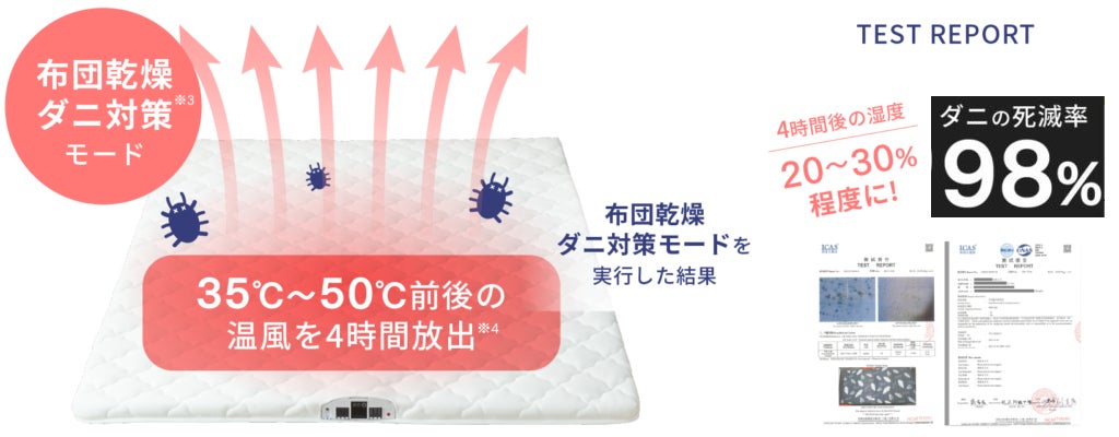 50℃の高温風を4時間放出。マットレス内を除湿し乾燥させることでダニを98%死滅させます。
