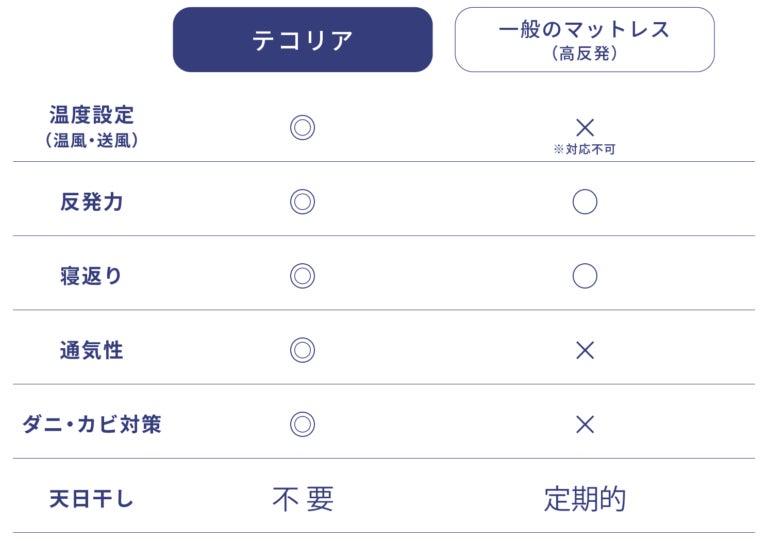 テコリアと一般的なマットレスの機能を比較してみました。※自社調べ