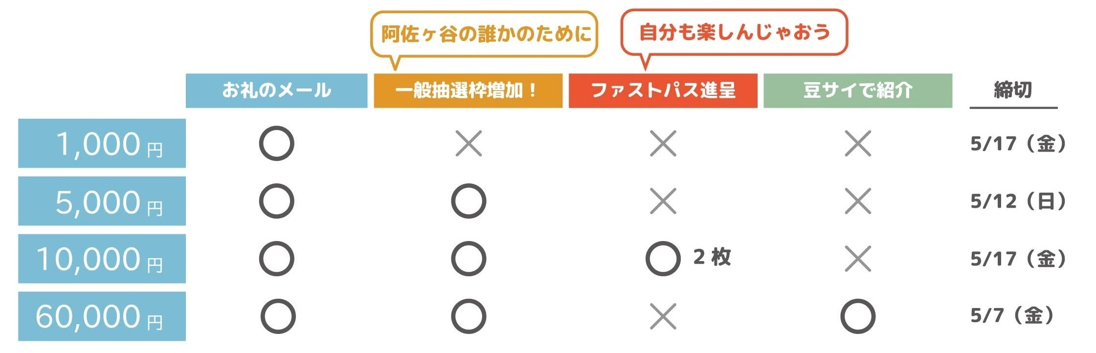 ご支援1口ごとに、阿佐ヶ谷の街の誰かに、無料乗車券の当選枠が3枚増やせることに加え、(ほぼ)どの時間帯でも(ほぼ)並ばずに乗れる「ファストパス」を2枚(小さいお子さんなら最大4名乗れます)、支援者ご本人に提供いたします。