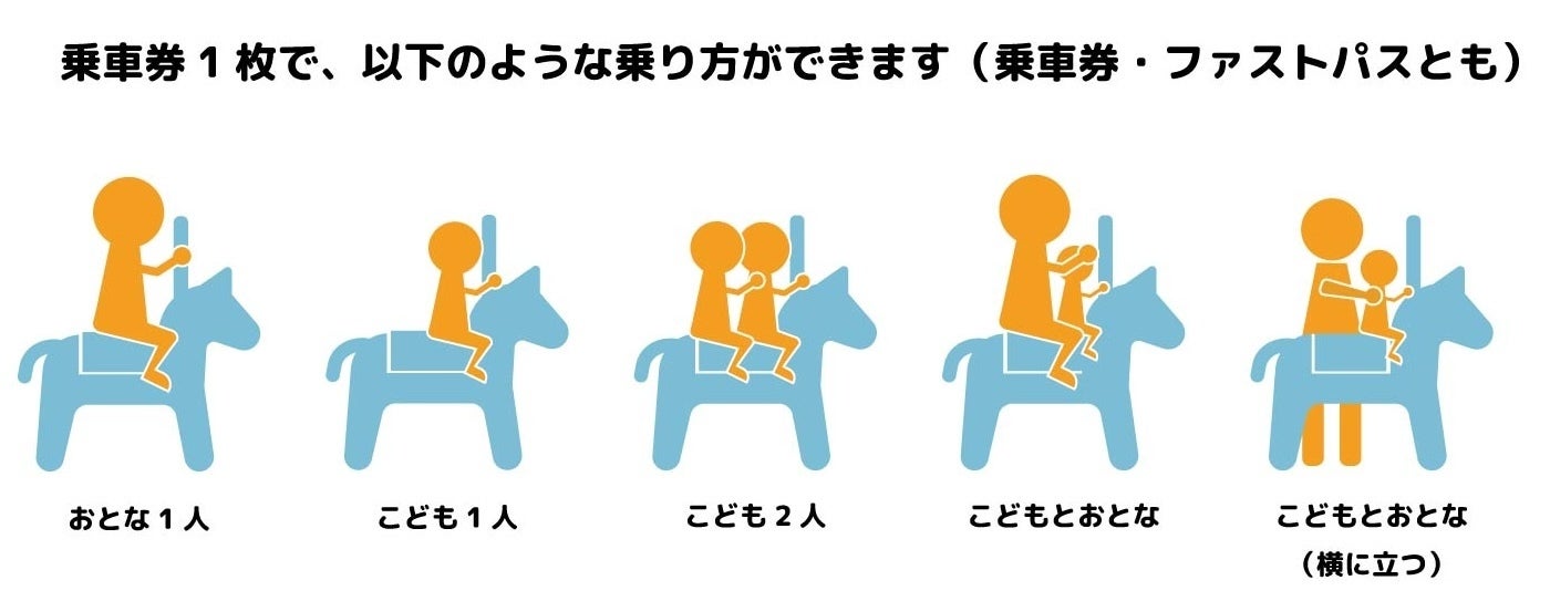 木馬1台で2人まで乗車できます。ちいさなお子さんは大人と一緒に乗ることをお勧めします。大人が木馬の脇にたって支えながら乗ることもできます。大人は1人1台で乗った方がいいと思います。