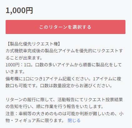 • まずは25%達成の感謝を! ご支援いただいた皆様ありがとうございます!残り75%、ゴールはまだ遠いですが、じわじわと増えていくと信じています。さて、実はクラファンを始める前にリターン品に関しての意見を募っていました。そこで挙がったのが優先リクエスト権でした。作るのがどうしても難しいものもあるので、一旦は保留しましたが、より広くご支援を募る+製品ネタ収集を兼ねて、設けるのはアリだなと思い、本日追加しました。1000円で1口リクエストが出来るプランです。1口につき1種のアイテムをリクエストでき、アイテム一つに複数口の投票も可能です。複数口の投票は、プランを選ぶ際に数量を指定してください。プロジェクト成功後に開票し、カ式機銃車完成後から口数の多いアイテムから順番に製作していきます。注意点として、小物・フィギュア系に限ります。流石に車両系などをリクエストされてしまうと荷が重いため……また、製作するタイミングで既に他社から同様の製品が出ていた場合は製品化を見送る可能性があります(返金の対応はできません)ので、なるべく被らなさそうなものをお待ちしています。「これリクエストして大丈夫かな?」というのはコメントで質問してください。リクエストどしどしお寄せください!X(旧Twiter)やBOOTH等で既に過去リクエストしているという場合でも、今回の優先リクエスト権が先になりますので、ダメ押しでのリクエスト大歓迎です。よろしくお願いいたします! もっと見る