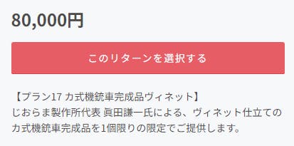 目標額は80万円です。集まった支援金は、カ式機銃車キット開発のため、具体的には以下のような使いみちで使用させていただきます。