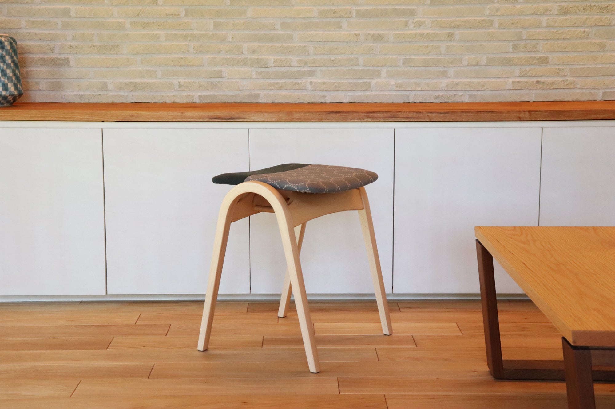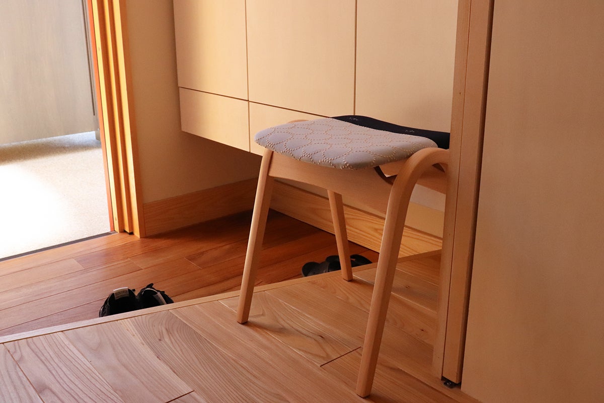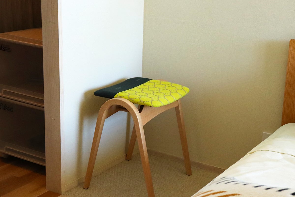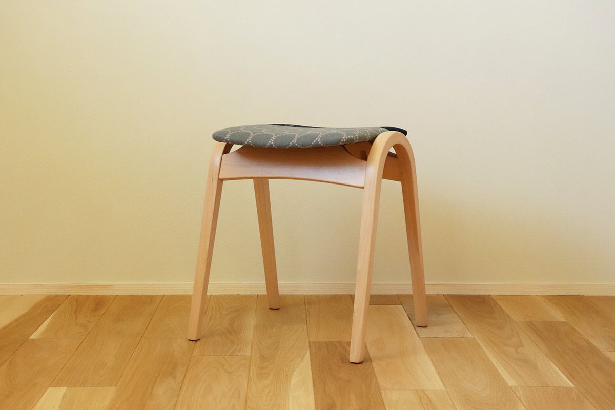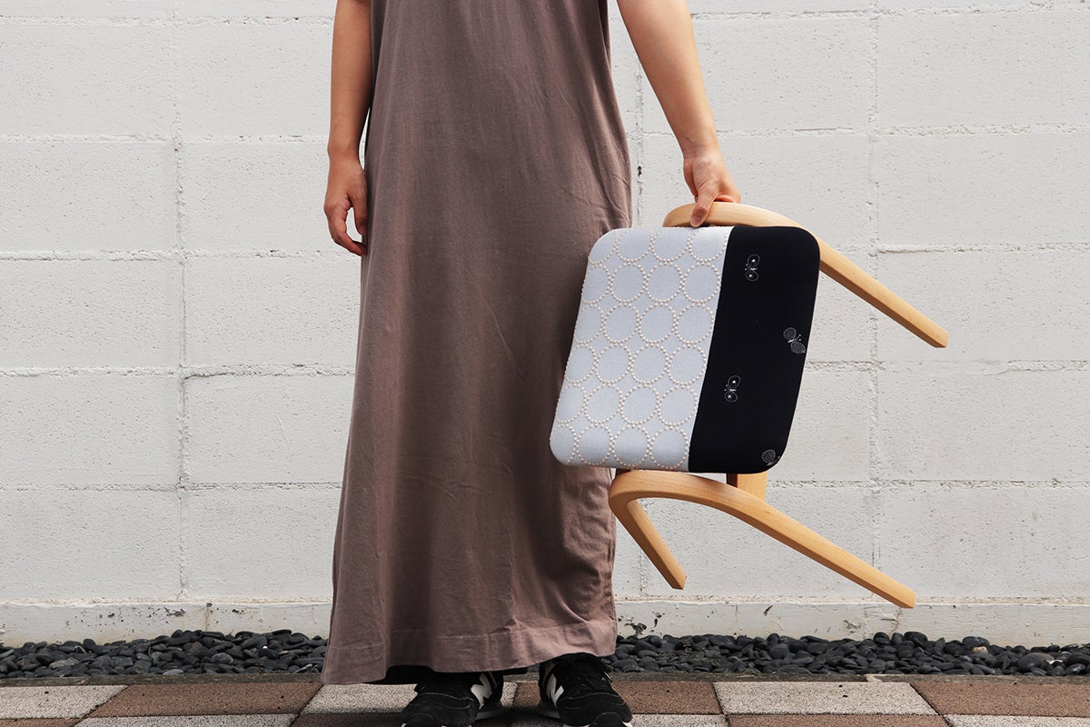 私たち三島家具ではお客様に商品を通じて「丁寧な暮らし」を提案しています。永く愛着を持って使っていただくように商品のセレクトや開発には独自の基準を設けデザインは勿論、構造や修理が可能かも含めて判断しています。 そんな中、三島家具でも取り扱いのある「秋田木工」から1958年に発表されてから今まで合計生産数120万台を超えるベストセラー、ロングライフで長く作り続けられているスツール「No.202」にスポットを当て、同じく三島家具で主にオリジナル商品の開発をする際に使用するミナ ペルホネンの生地から出る「端切れ」を使用したサステナブルで個性的なスツールNo.202を作りました。今回は”tambourine”と”choucho”の生地を絶妙なバランスで組み合わせた、特別なスツールです。
