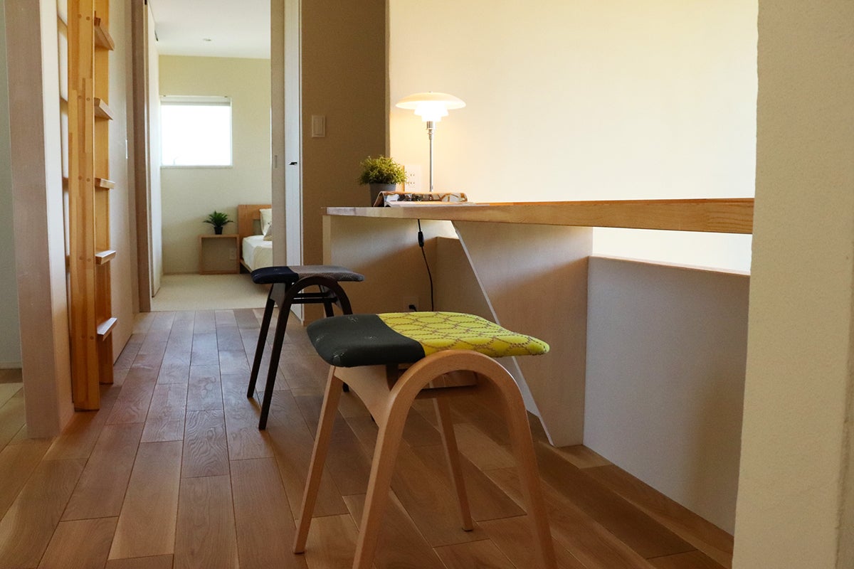 デスクにも使えます。スツールだと背筋が伸びて以外に作業がし易いです。背もたれがないので座面が見やすく目立ちます。親子や兄弟で色違いで並べてもかわいいですね。