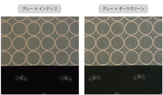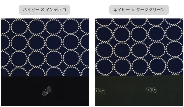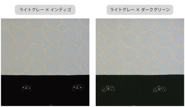 刺繍について厳密には裏と表がございます。表面の方がより刺繍がふっくらした仕上げになっています。よく見比べないとわからない程度ですので、この商品は裏面も表として使用しております。以上ご理解いただいた上でご使用ください。 ”tambourine”の生地:(表イエロー/裏グレー、表ライトグレー/ネイビー)”choucho”の生地:(表インディゴ/裏ダークグリーン)
