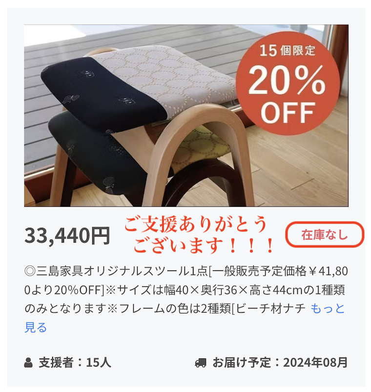 2024/05/16 14:20こんにちは!三島家具CAMPFIREプロジェクトメンバーです!限定で15脚ご用意していた20%OFF早割の分が早くも在庫なしとなりました!ご支援いただいた皆様に心から感謝申し上げます!数に限りはございますが、まだほかにも限定分のご用意はございますので、ご友人へ口コミ拡散をお願いいたします!今回、店頭でも「いまクラウドファンディングでこういった催しをしていて」とお話しすると、ご興味を持っていただけるお客様も多く、改めてミナペルホネンの持つ魅力に気づくことができました。三島家具伊勢崎店、宇都宮店ともにミナペルホネンを使用した家具や小物を多数展示しております。ご興味がありましたら是非魅力に触れにいらっしゃってください!ご来店をお待ちしております!三島家具オンラインショップでもミナペルホネン特集のページをご用意しておりますのでチェックしてみてください!mina perhonen|ミナペルホネン - 丁寧な暮らしの店|三島家具オンラインショップhttps://mishimakagu.net/?mode=grp&gid=2610066 もっと見る