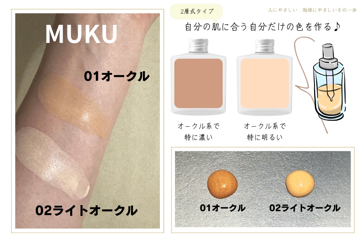 メイク崩れの原因となる過剰な油分をMUKU美容液ファンデは最小限にとどめることでヨレにくく・粉ふきがない仕上がりは無垢肌のような素肌感に近いです。洗顔で簡単に落とせるので肌への負担が気になる方にもおススメです。各色をブレンドすることで煩わしい色選びから解放。