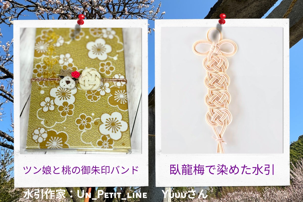 Yuuuさんの作品は、この55株国の天然記念物の臥龍梅で染めた美しい桃色と道真公から受け継ぐエネルギーを込めた水引で一本一本つむいだ作品です。