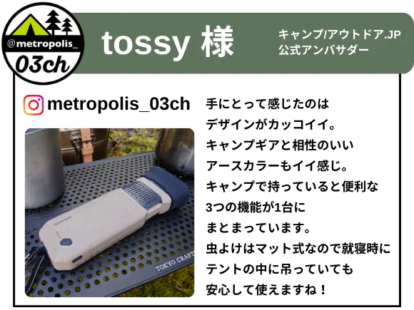 今回は、キャンプ/アウトドア.JP 公式アンバサダーの「tossy」様のレビューです。