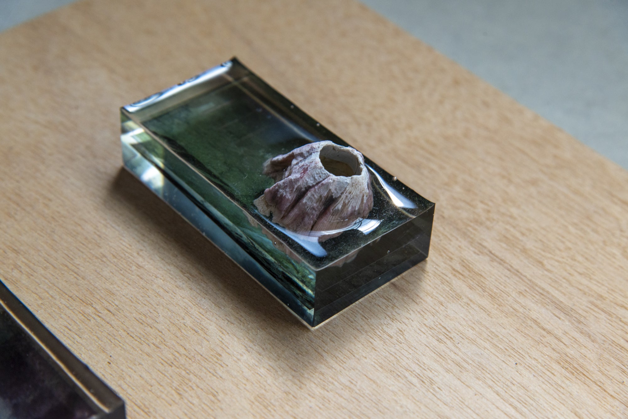 城ヶ島で撮影した「地球の時間軸と人間の生活の時間軸」に着目した写真を重ね、同じく城ヶ島で採集した貝殻やシーグラスを埋め込んでいます。