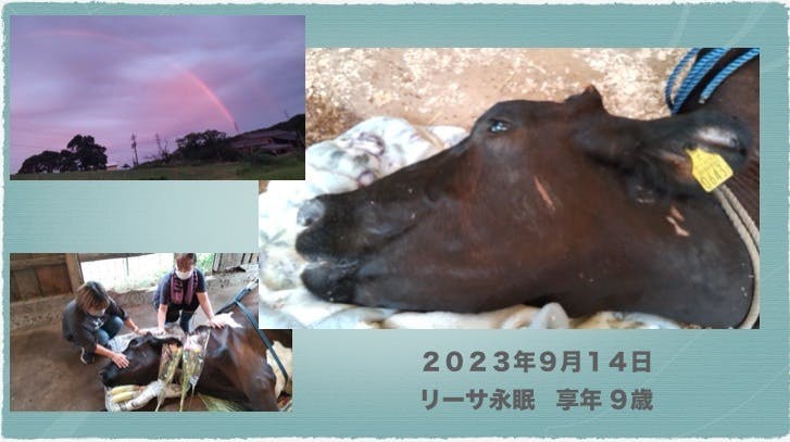 私はリーサの死に目には会えていません。リーサは自分がつらいのに、いつも私の事を考えてくれていて、最期の最期までそうでした。牧場にはトイレが無く、熱が出たリーサに一晩付き添った私は、いつ家に帰って来ようかと思案していました。夜中に熱が下がり、朝は少しではありましたが水も飲み、青草も食べてくれたので、先生に様子を伝え、すぐ帰るからねと声をかけて牛舎を後にしました。ですが、用事を済ませて牛舎に戻るとリーサはもう息をしていませんでした。体はまだ温かく…。私の車の音を聞いたでしょうか。「お母さん待ってたよ」と言っている様な穏やかな顔でした。リーサは最期の力を振り絞って、元気なフリをして、大丈夫だから家に帰ってきていいよと。リーサの事を思うと、最期、そばに一緒にいることだけが看取りでは無いのだなと改めて思いました。熱も下がり、穏やかな呼吸で、ホウちゃん達に見守られ、安らかに旅立ったと思います🌈